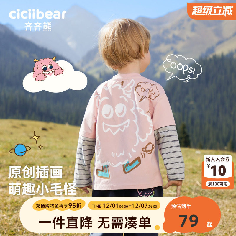 [7A抗菌小魔怪]齐齐熊男童t恤长袖春秋款宝宝假两件纯棉儿童女童