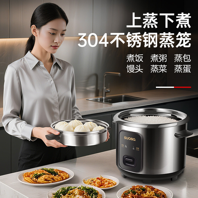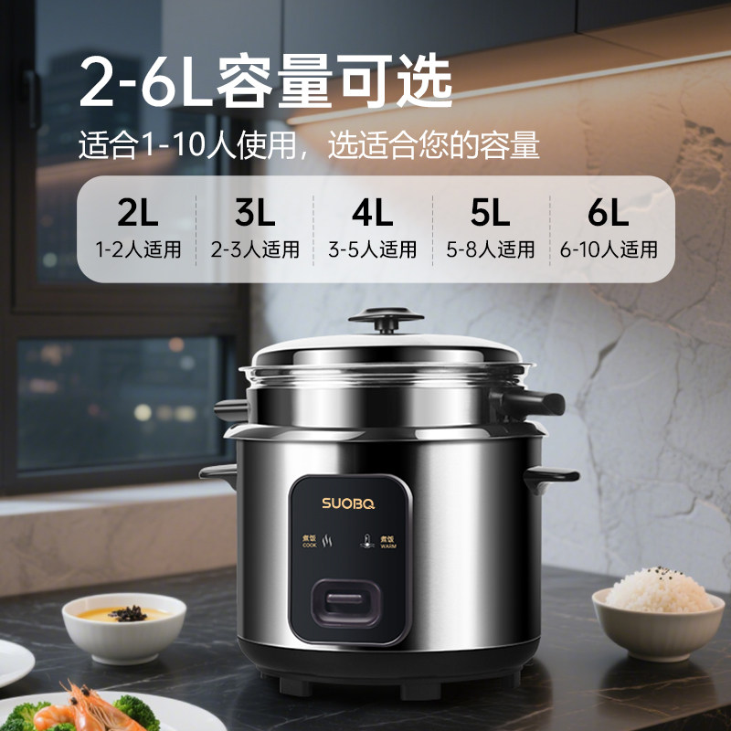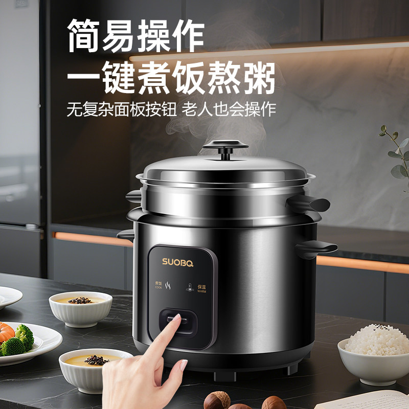 SUOBQ电饭煲新款家用0涂层食品级带蒸笼不锈钢1-10人老式电饭锅