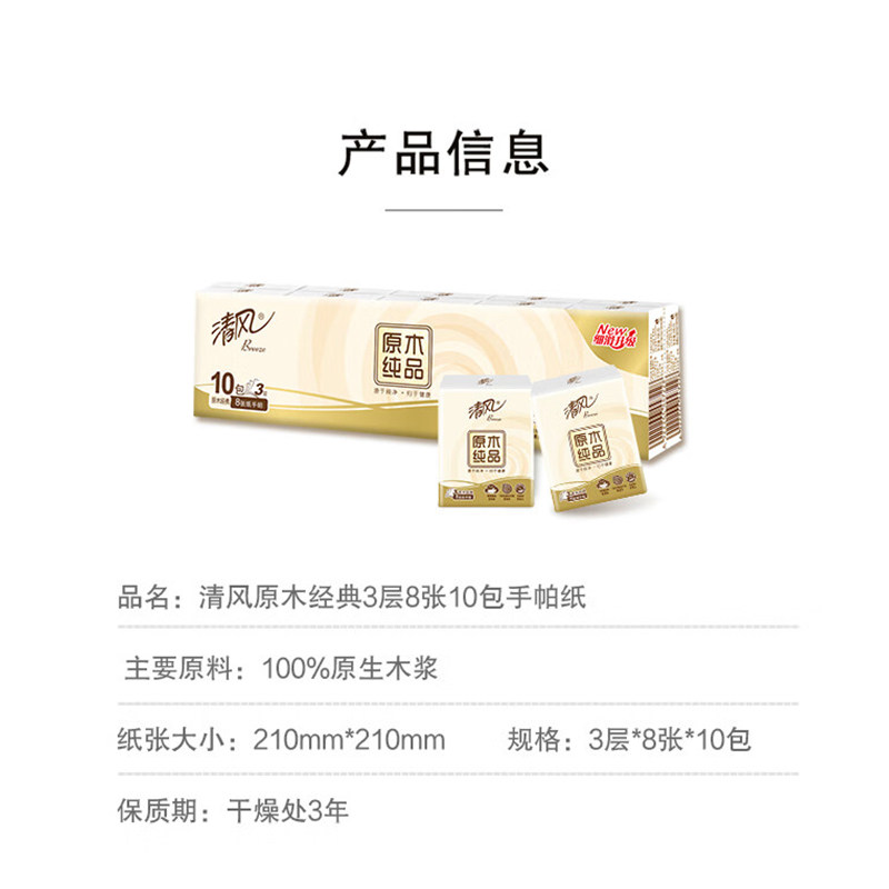 清风手帕纸原木纯品3层8张10包提装家用实惠装宿舍小包便携手帕纸