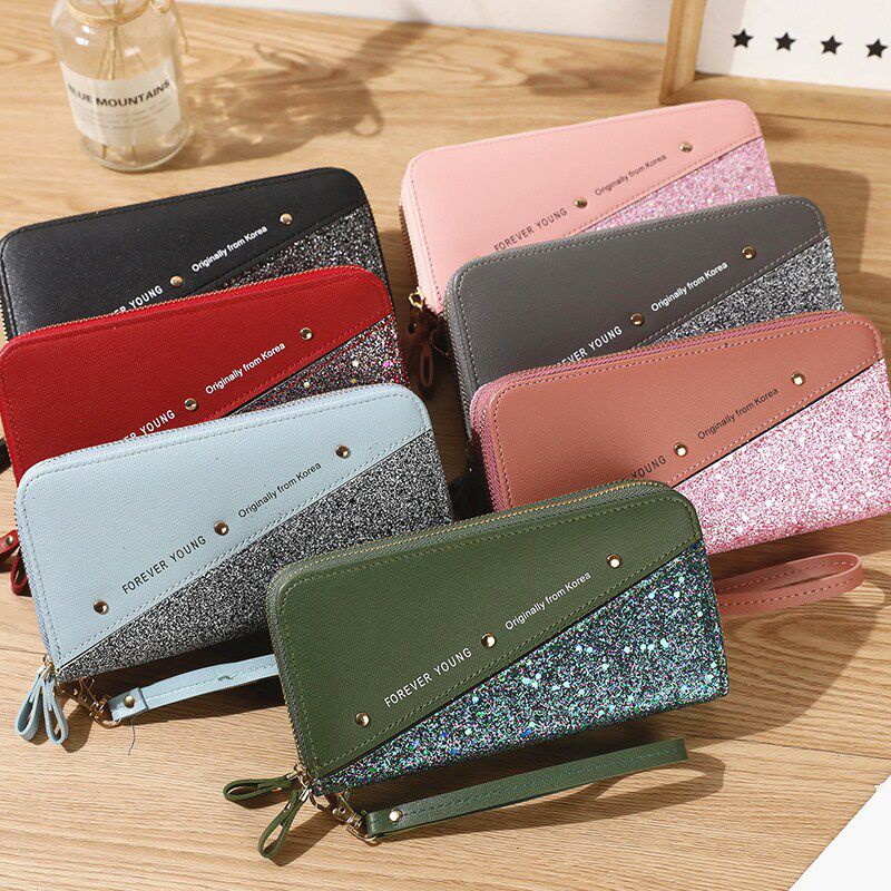新款女士长款钱包双拉链手机包学生铆钉钱夹大容量手拿包软零钱包