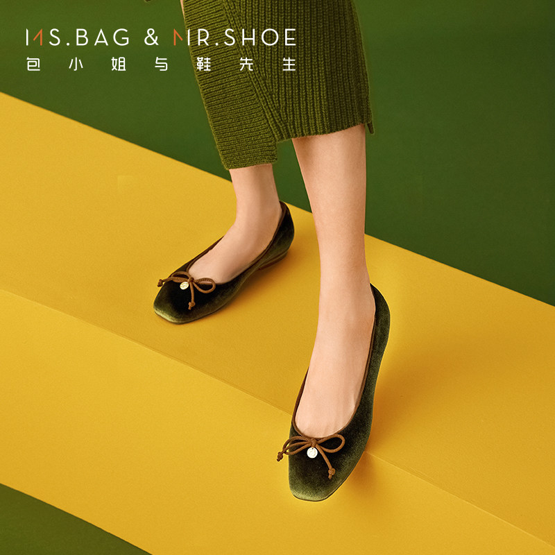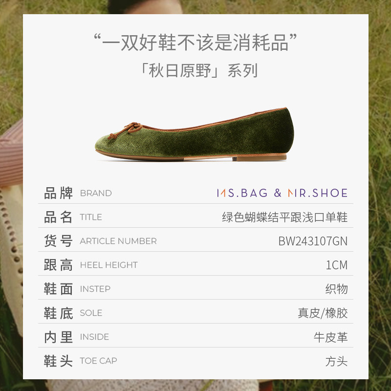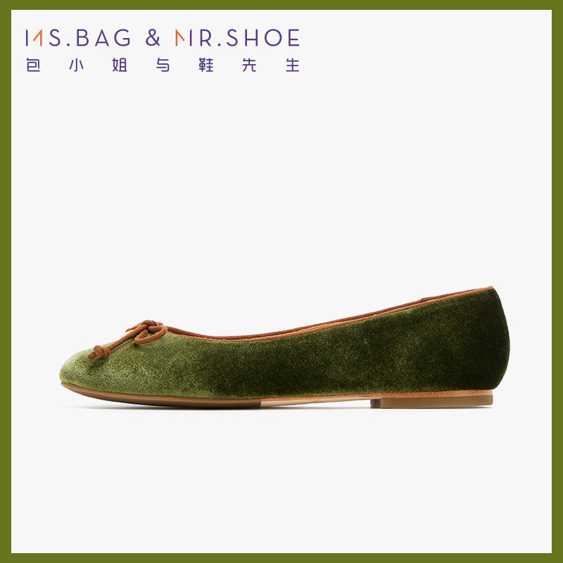 包小姐与鞋先生秋季绿色蝴蝶结平跟浅口单鞋女243107