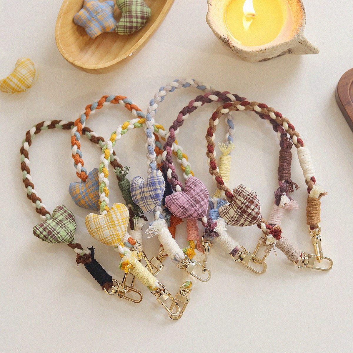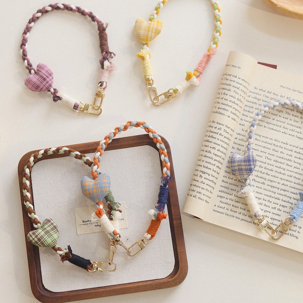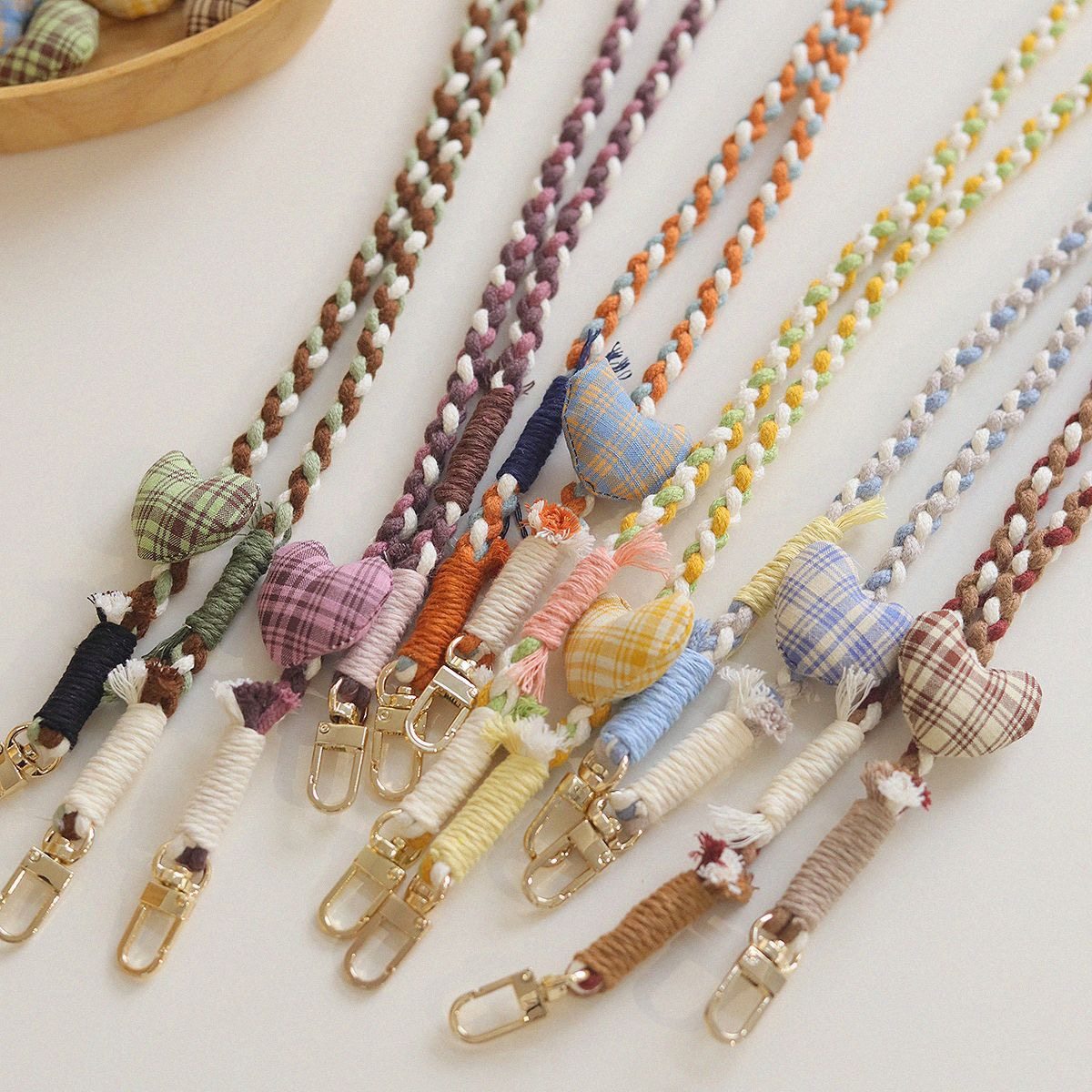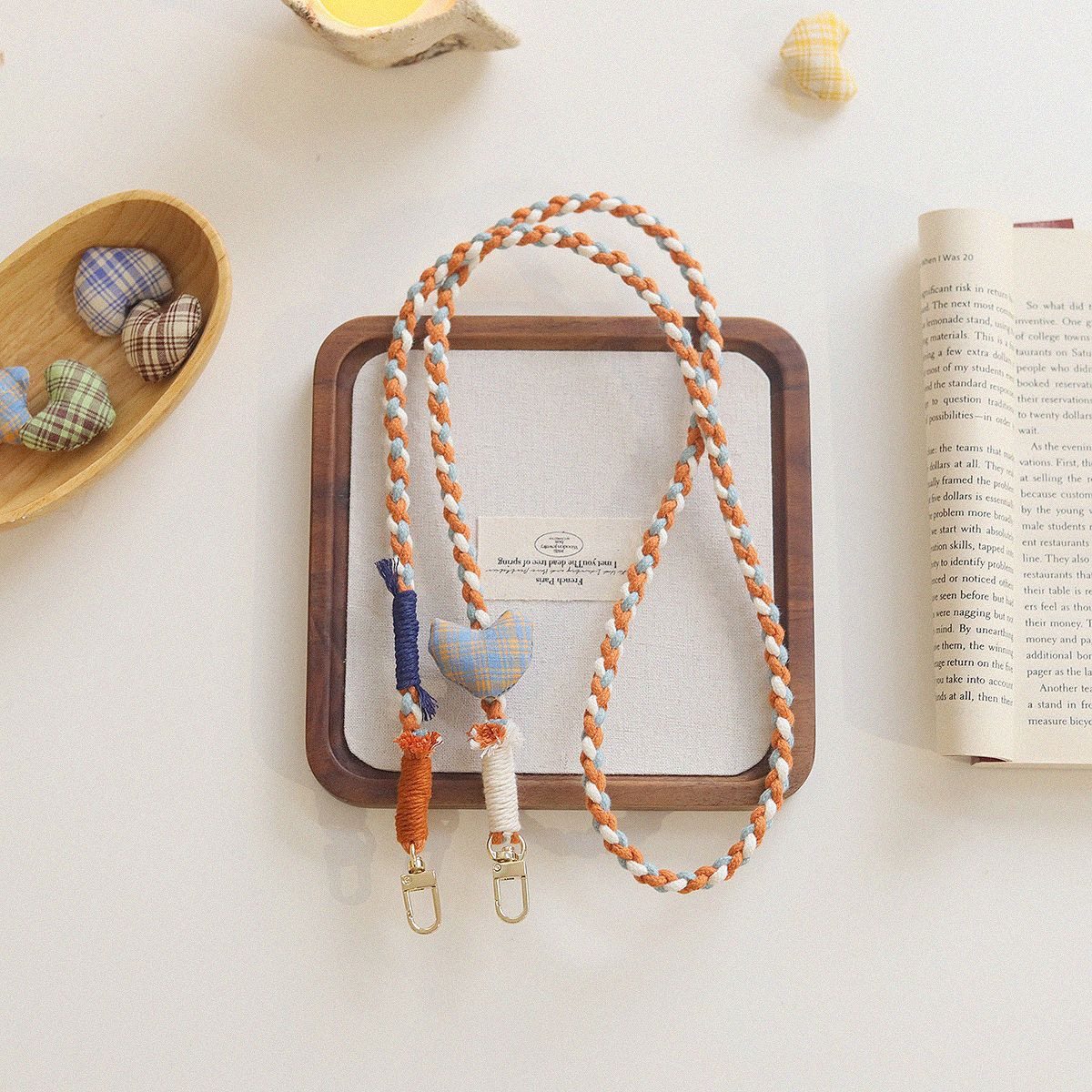 韩系ins格子布爱心手编混线手机挂绳斜跨长绳背带跨链麻花绳手腕