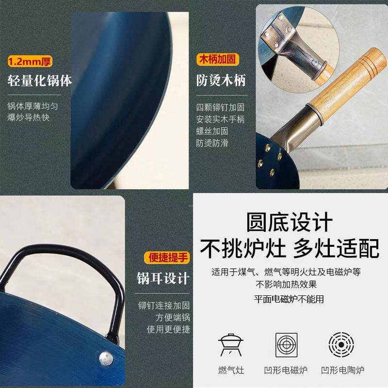 超薄无涂层家用炒菜铁锅不粘锅炒锅厨师专用圆底电磁炉适用全套
