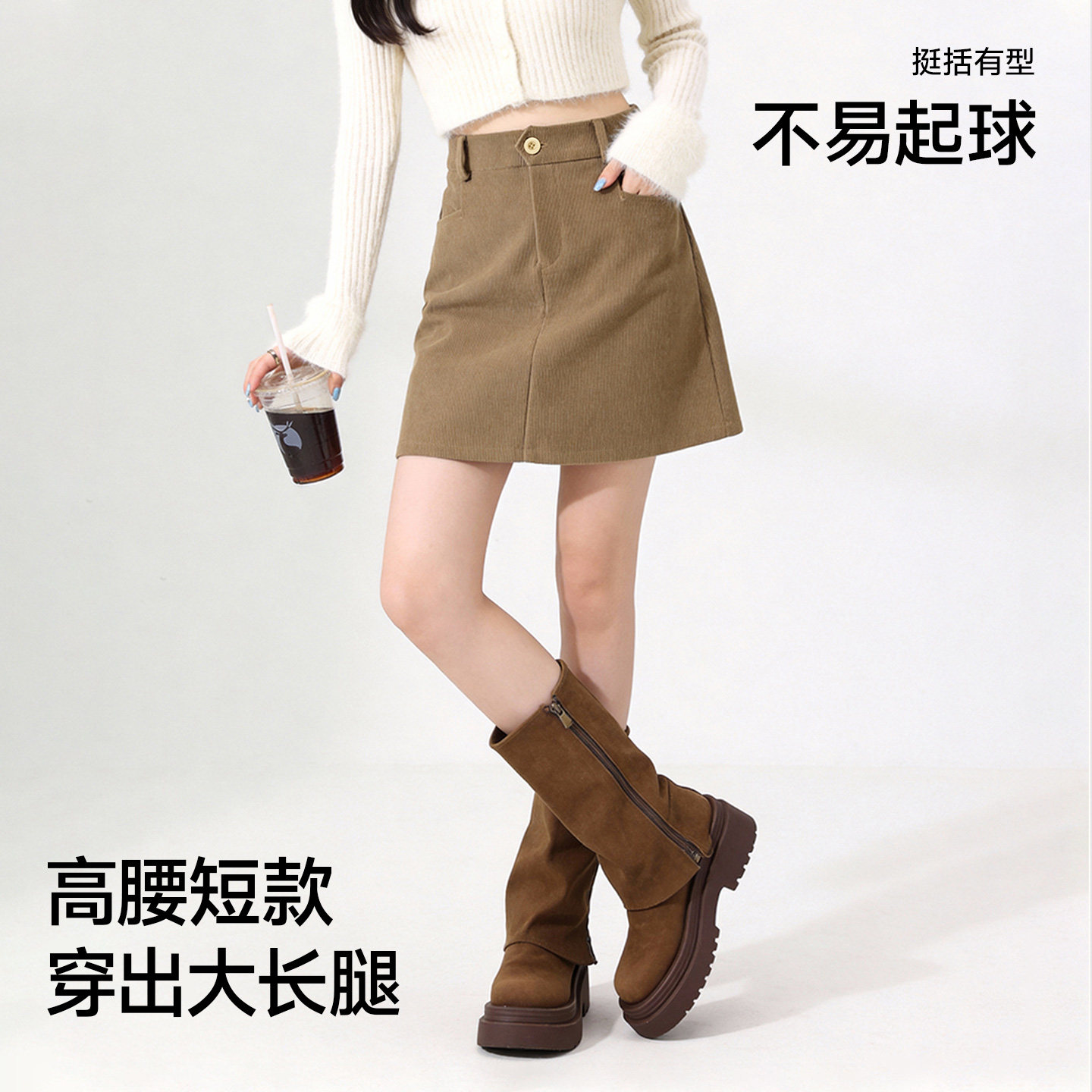 猫人咖色半身裙女士灯芯绒春秋短裙小个子2026年新款A字包臀裙子Z