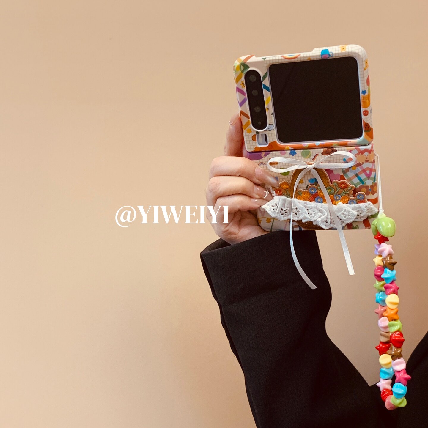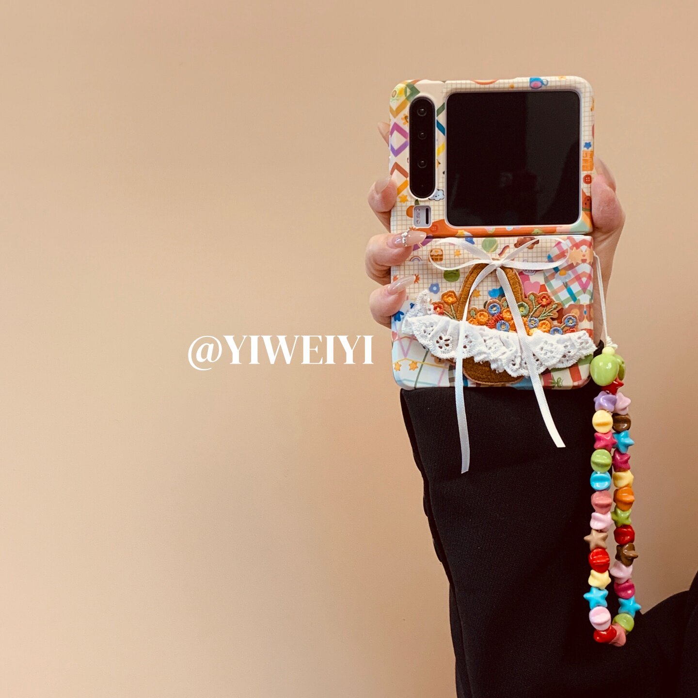 折叠屏手机壳拼色卡通格子蝴蝶结大花篮挂绳