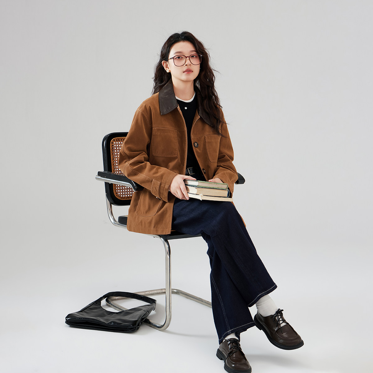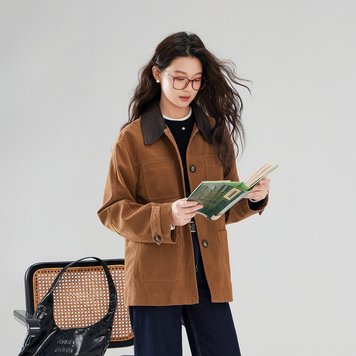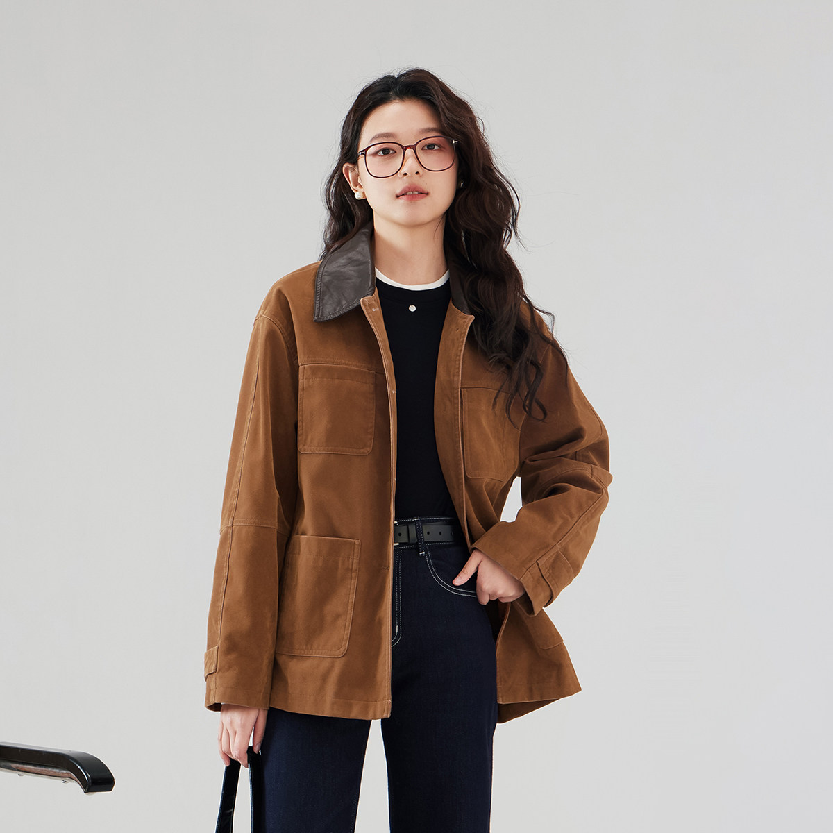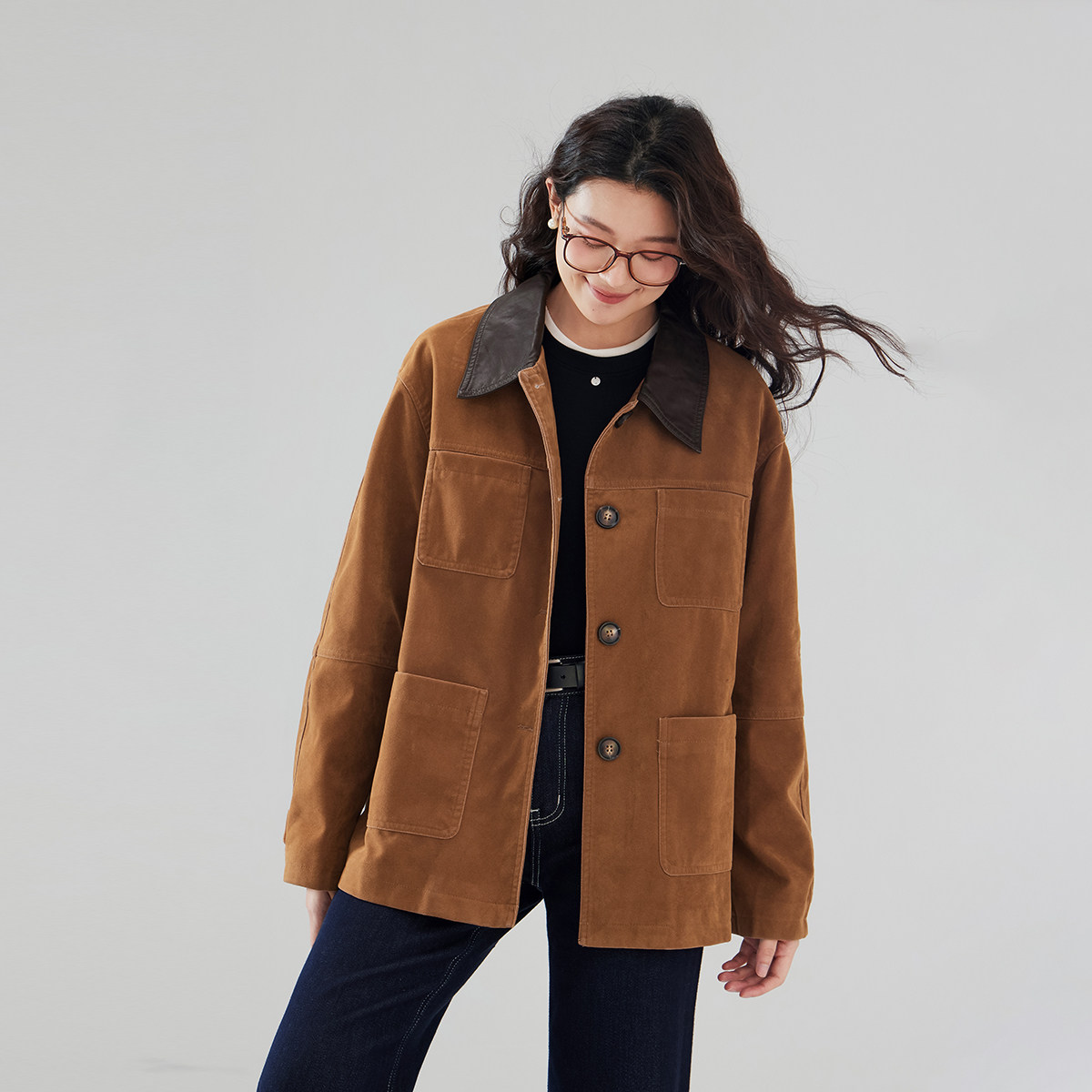 one more2026新款时尚撞色翻领鹿皮绒女装外套小个子工装西服