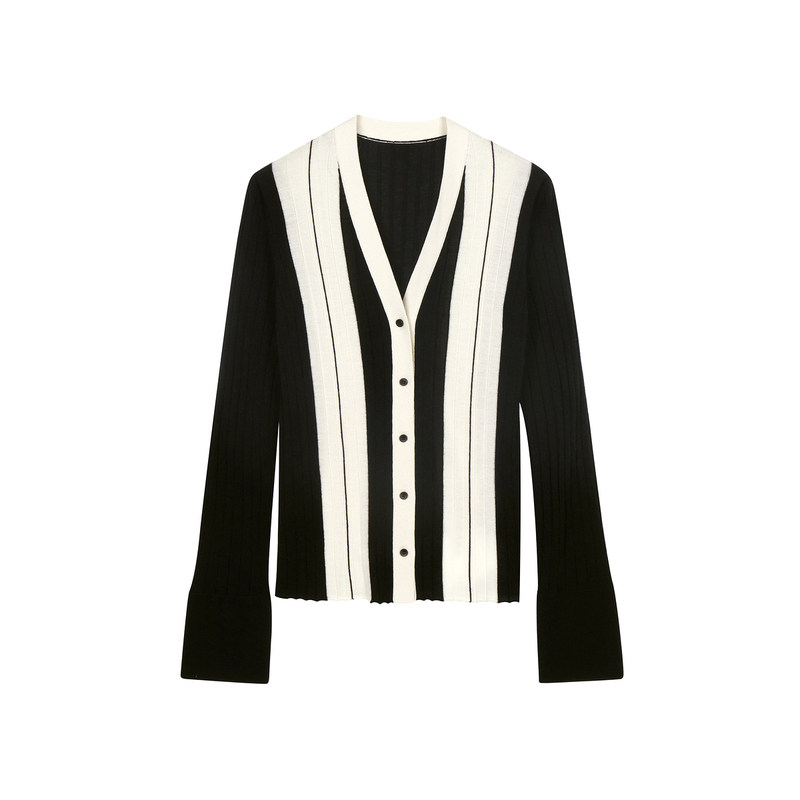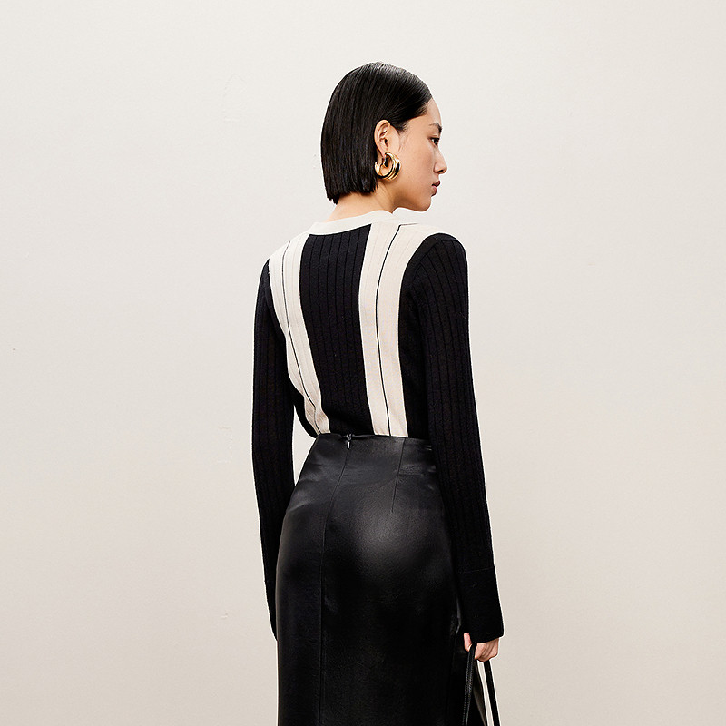 LESS秋含绵羊毛拼色V领修身针织衫直筒短款开襟毛衫女2O8312520