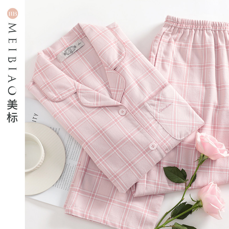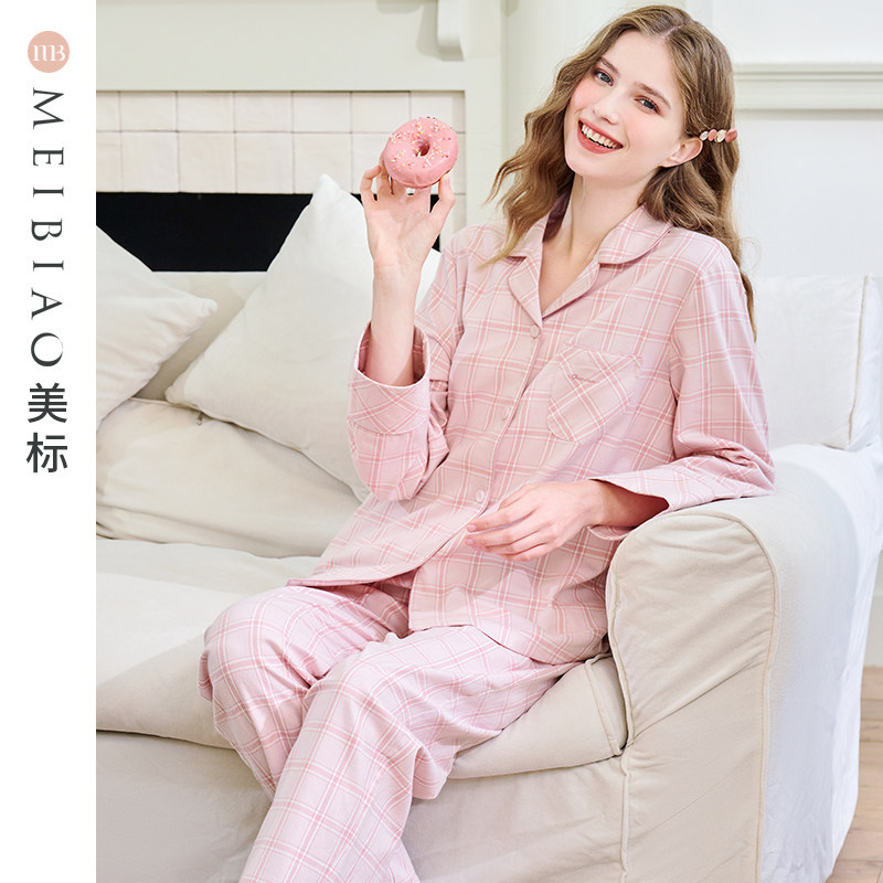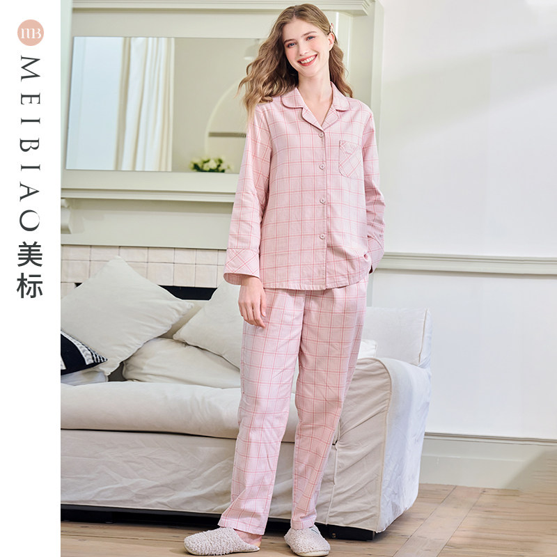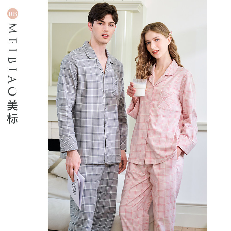 美标新款长袖情侣纯棉睡衣套装女士春秋格子全棉可外穿家居服男冬