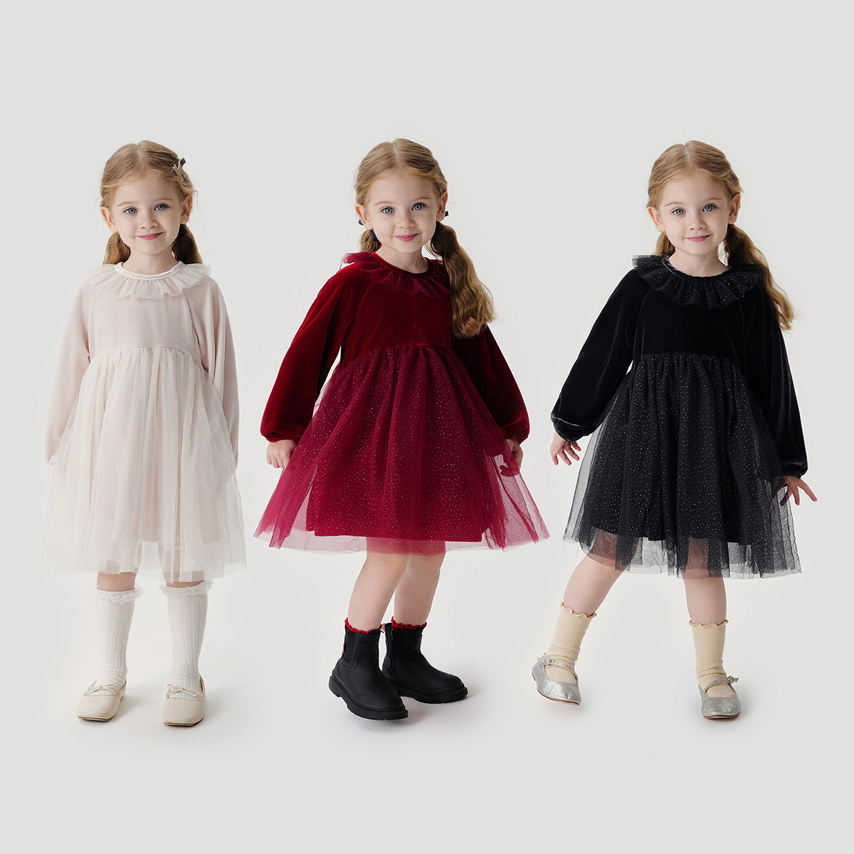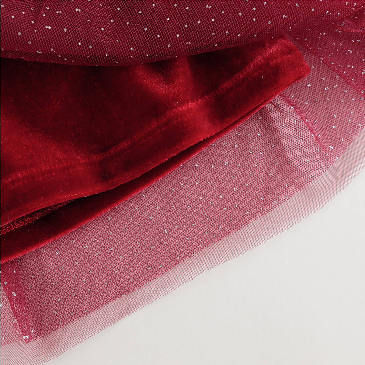 马克珍妮女童丝绒网纱拼接连衣裙宝宝新年红色裙子秋冬新款241110