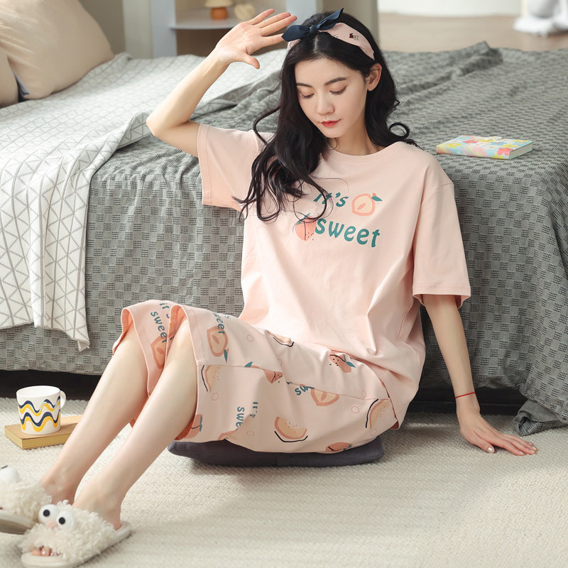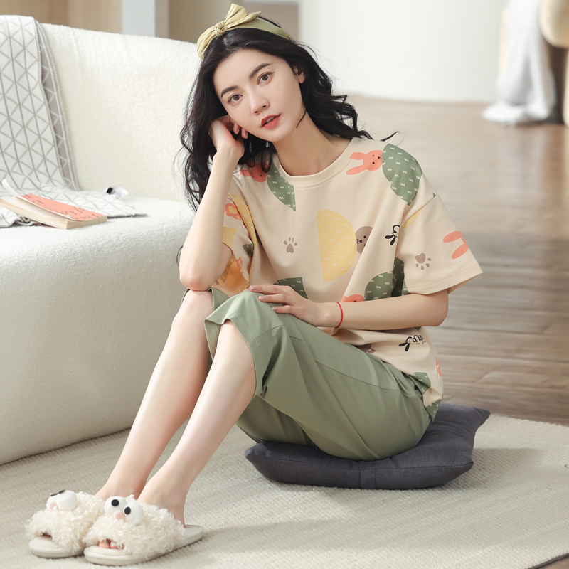 纯棉睡衣女夏季短袖七分裤2025新款女士带胸垫全棉家居服套装薄款