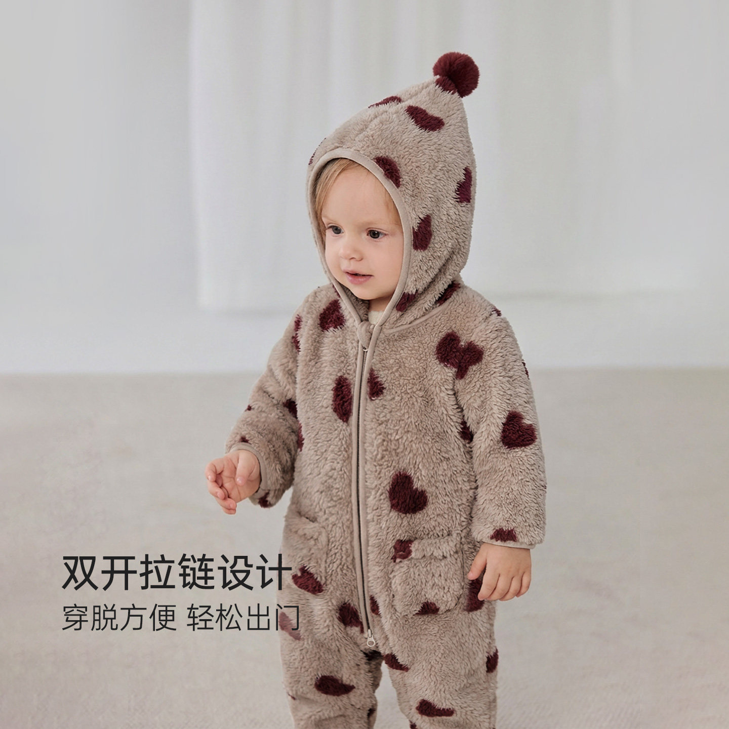 babylove宝宝毛绒连体衣秋冬季舒棉绒婴儿保暖哈衣爬服连帽外出服