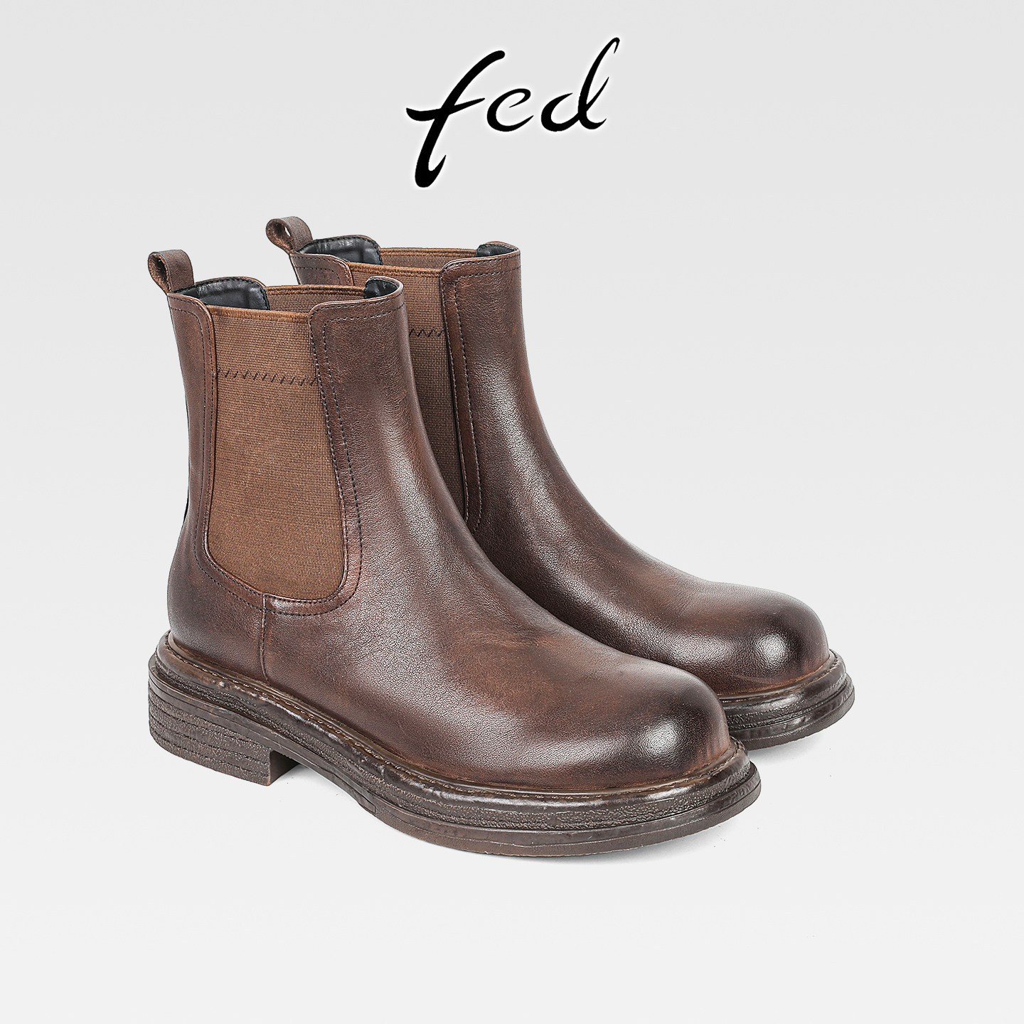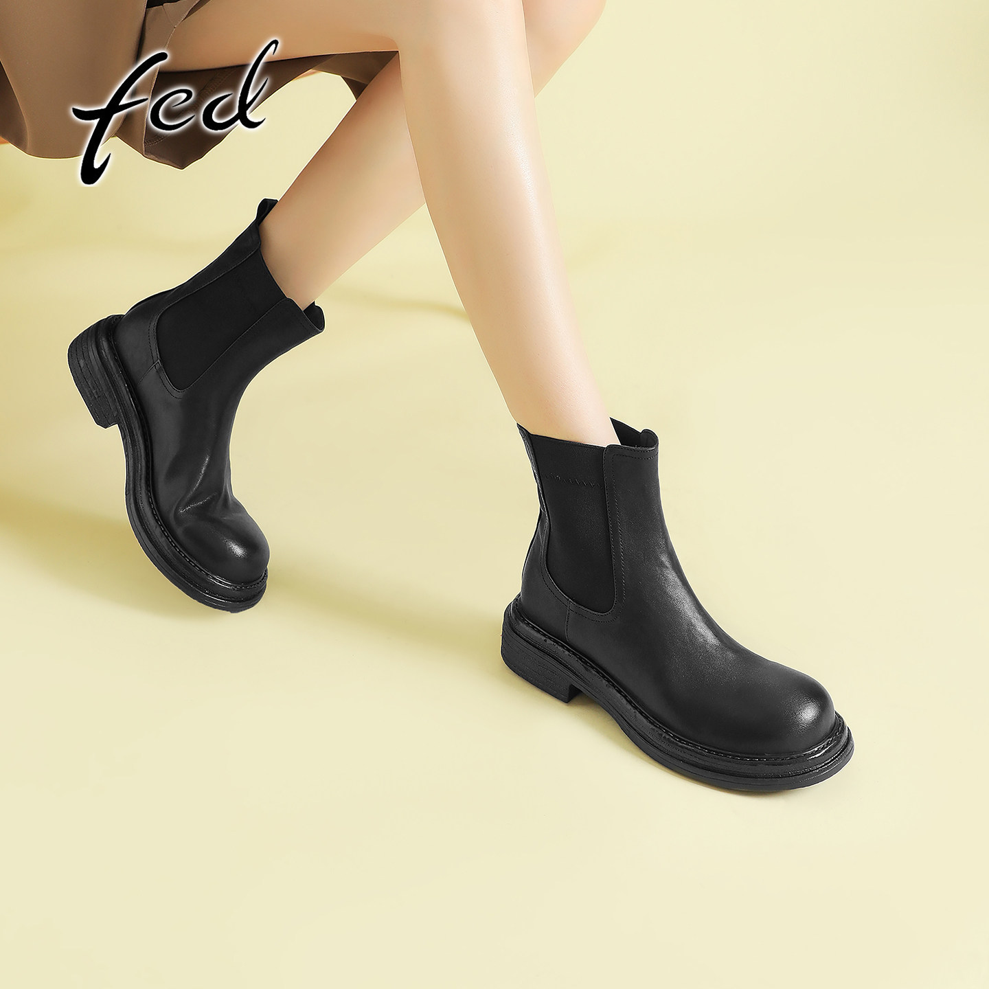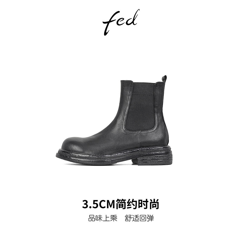 fed英伦风真皮粗跟厚底切尔西靴女烟筒靴秋冬款中跟圆头显瘦短靴