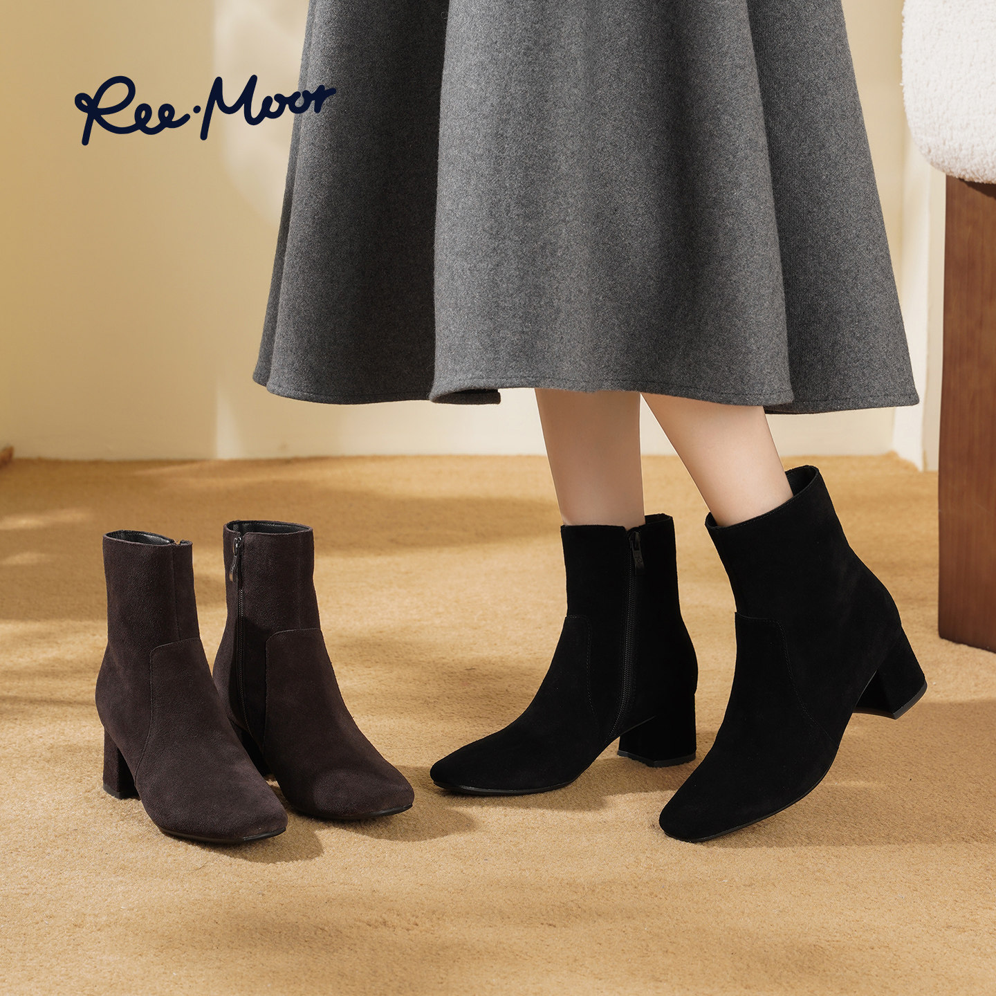 REEMOOR睿慕2025冬季新款粗跟厚底增高短筒靴简约百搭时装靴女靴