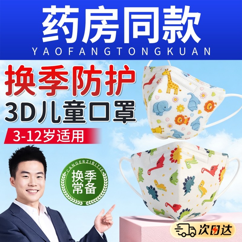儿童KN95口罩4D立体学生卡通可爱小学生3到10岁三层防护秋冬专用