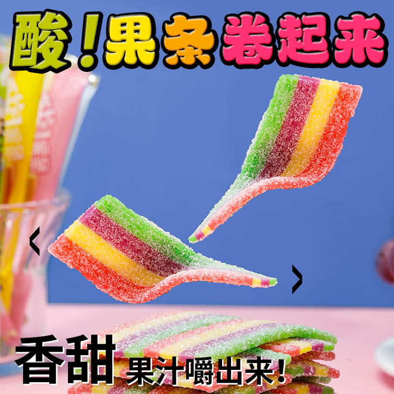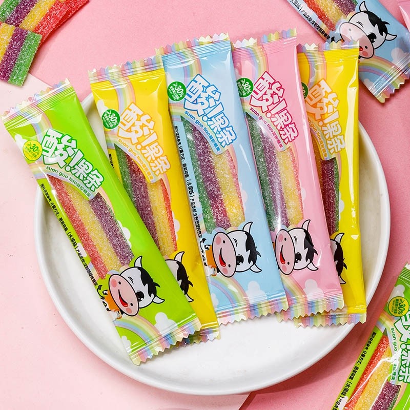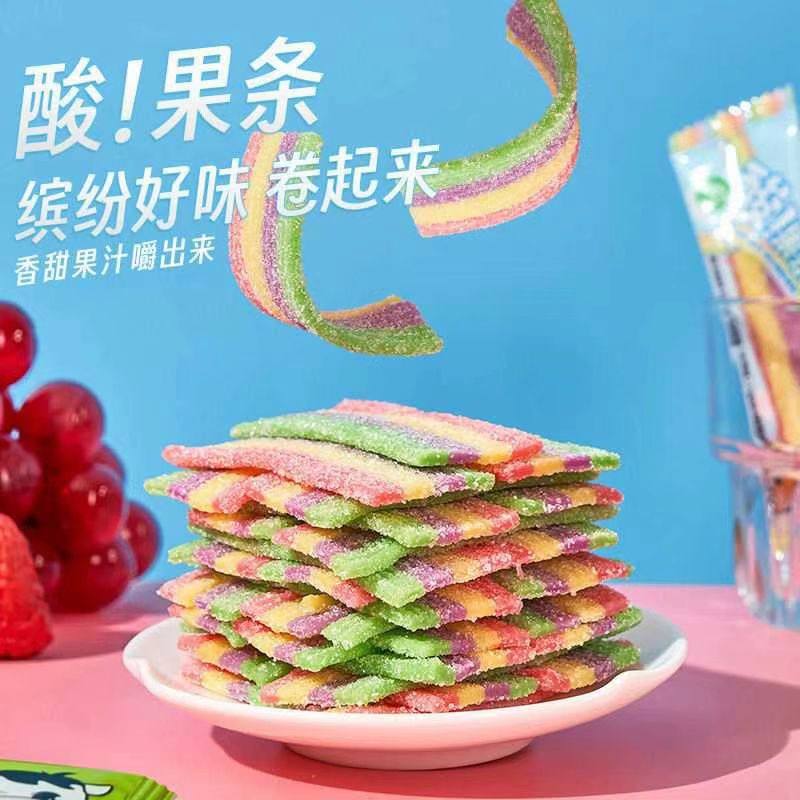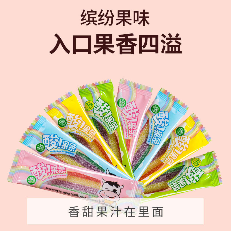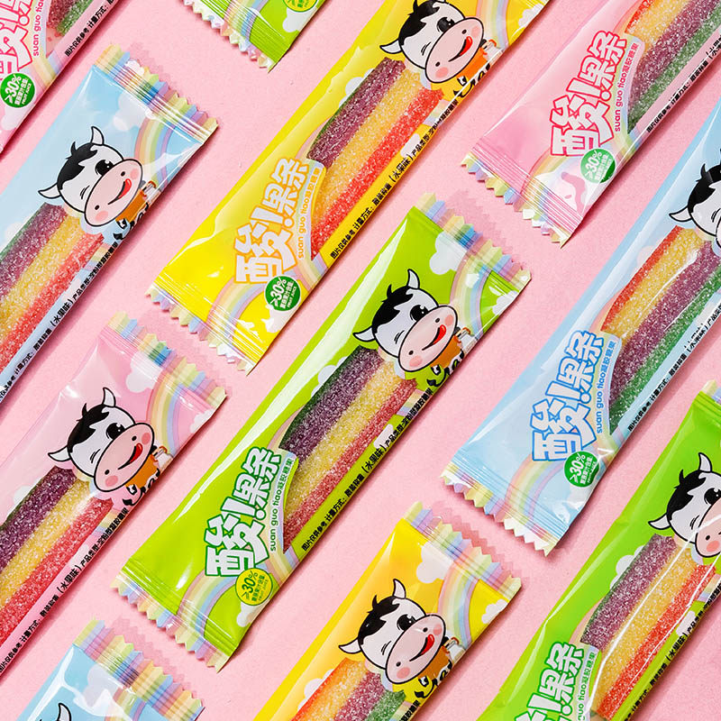 彩虹糖酸砂酸条软糖混合水果味橡皮糖果独立包装儿童零食散装批发