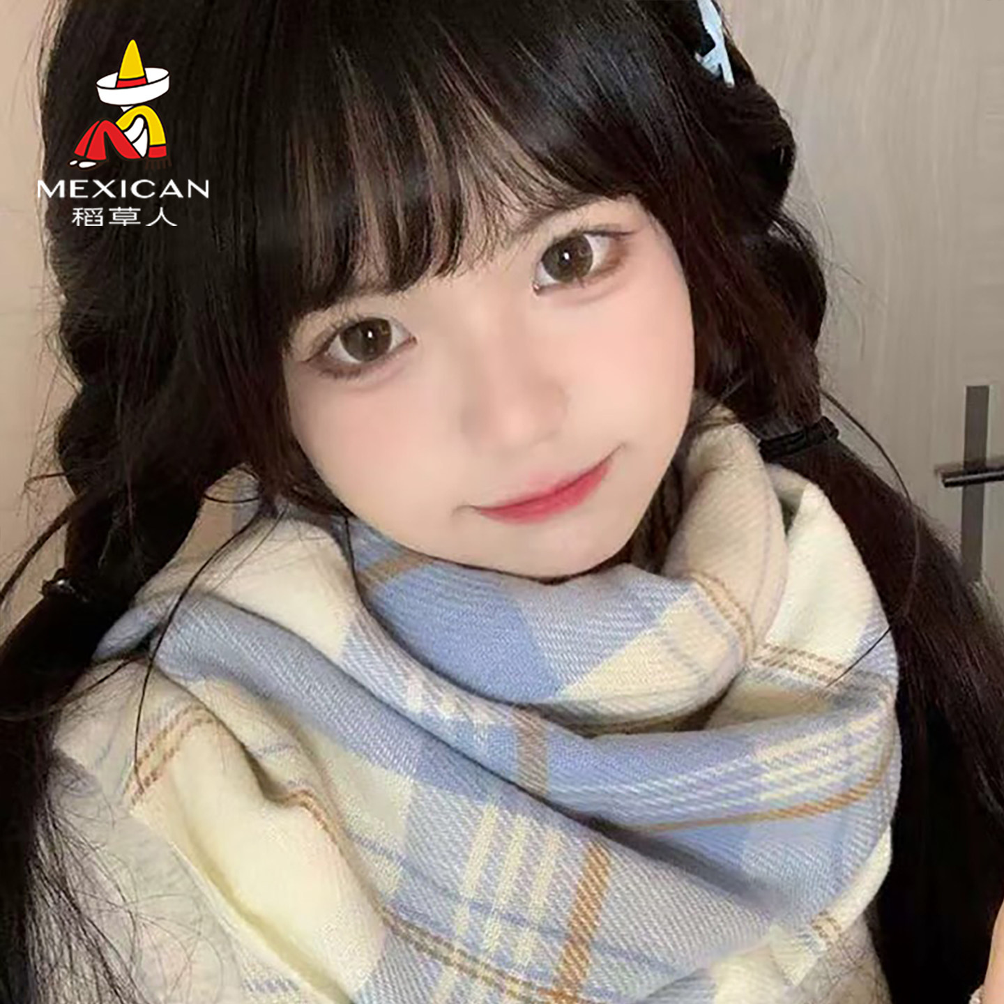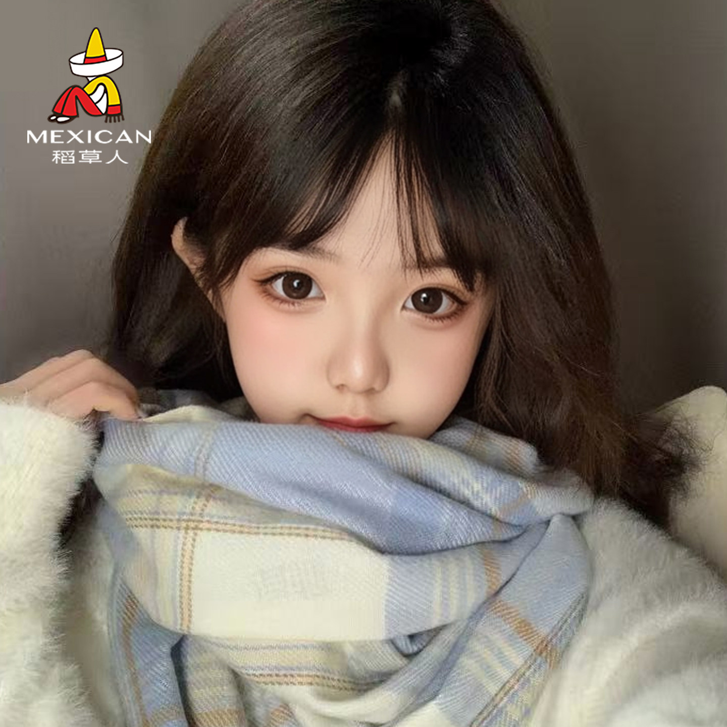 稻草人氛围感蓝色格子围巾冬季女高级感披肩2025新款学生围脖韩系