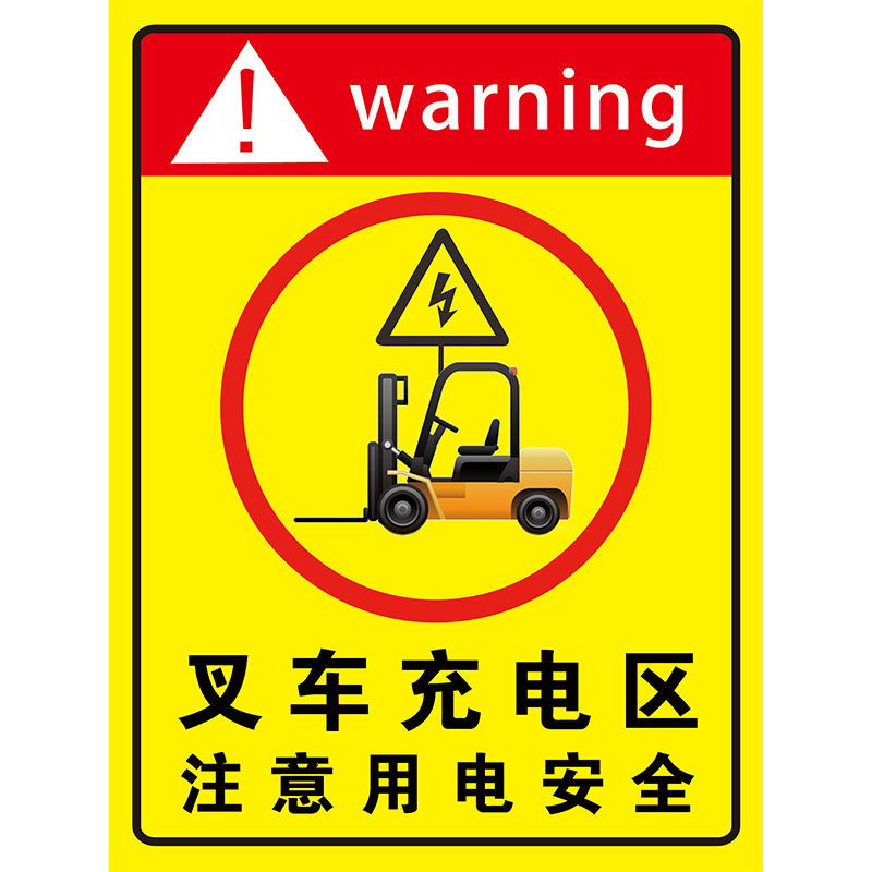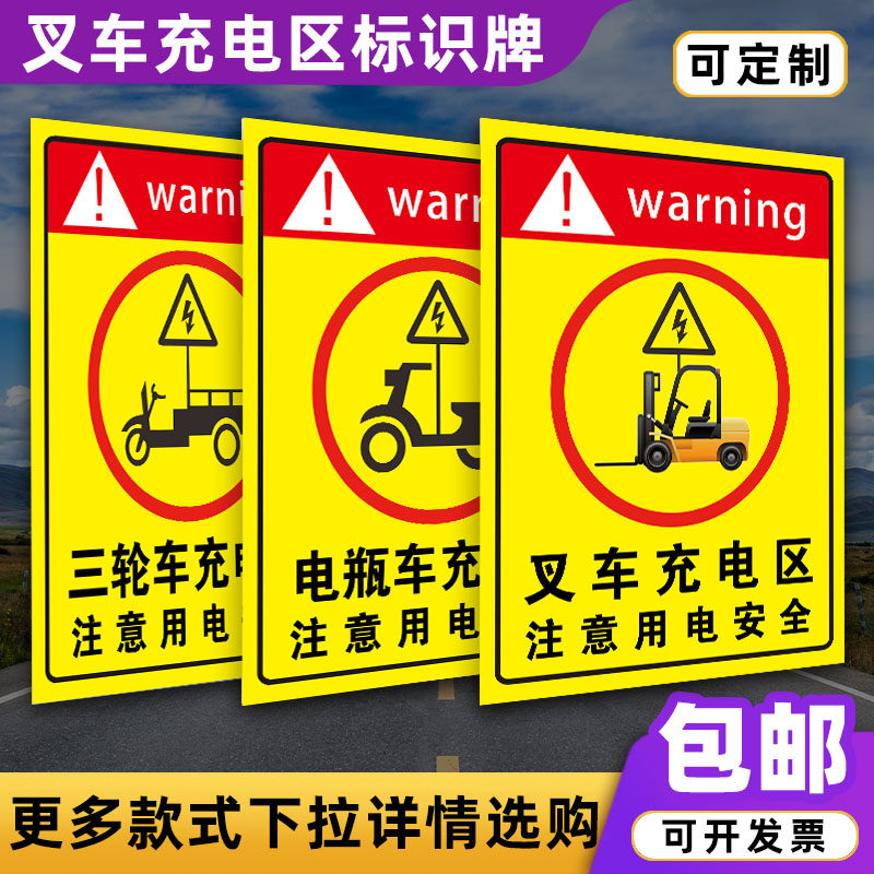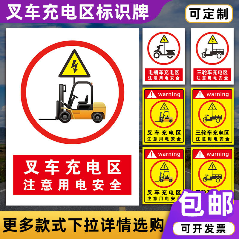 叉车充电区标识牌贴纸三轮车充电区电动车充电停放安全标识牌注意用电安全警示牌充电桩指示牌当心触电警示贴