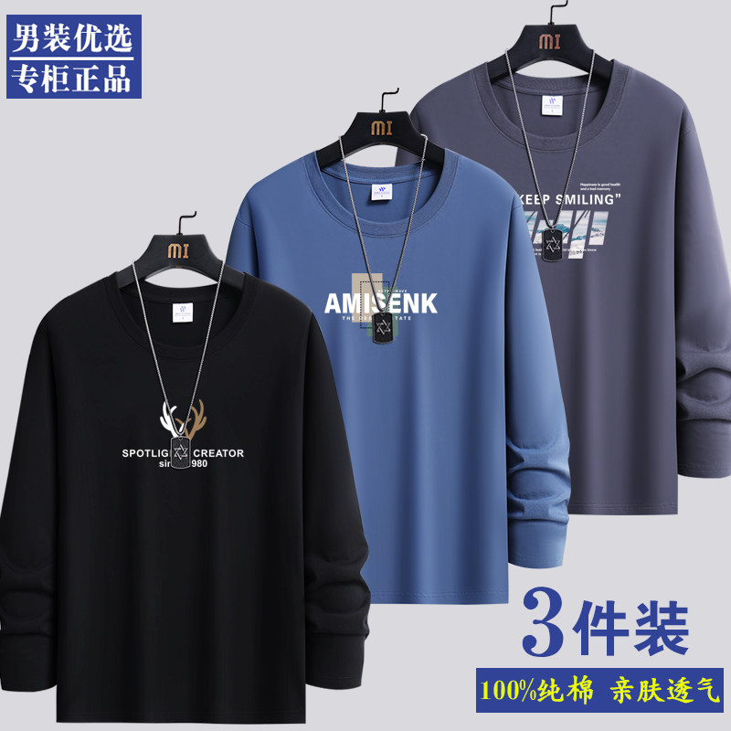 3件】100%纯棉长袖t恤男春秋季新疆棉圆领宽松大码休闲打底衫秋衣