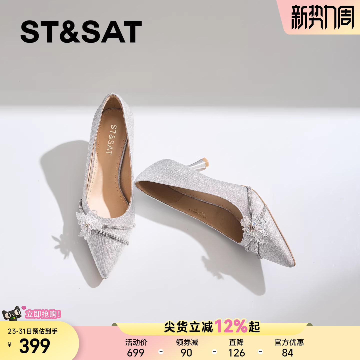 星期六精致尖头细跟浅口单鞋女2025春季新款水晶花朵绝美高跟婚鞋