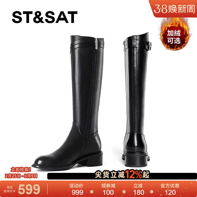 星期六加绒英伦长筒靴女2025秋冬粗跟圆头显瘦高不过膝全牛皮长靴