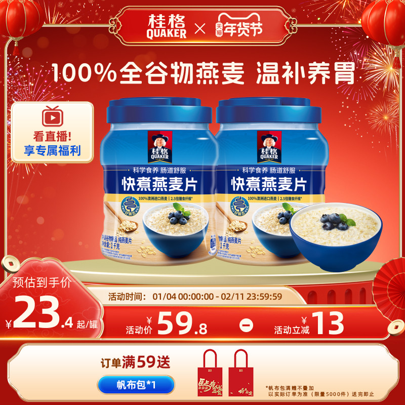 桂格快煮纯燕麦片冲饮谷物1000g*2罐原味煮食无白砂糖营养麦片