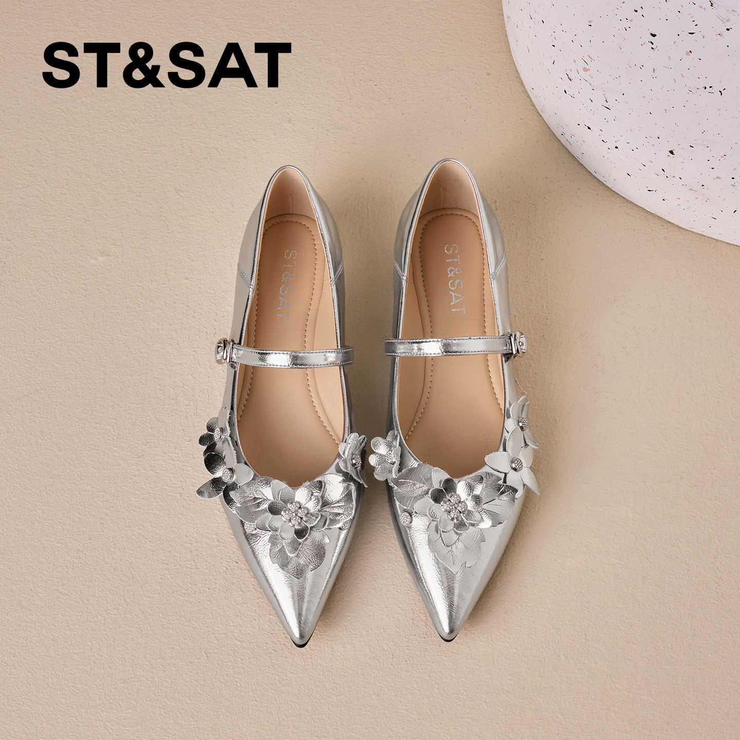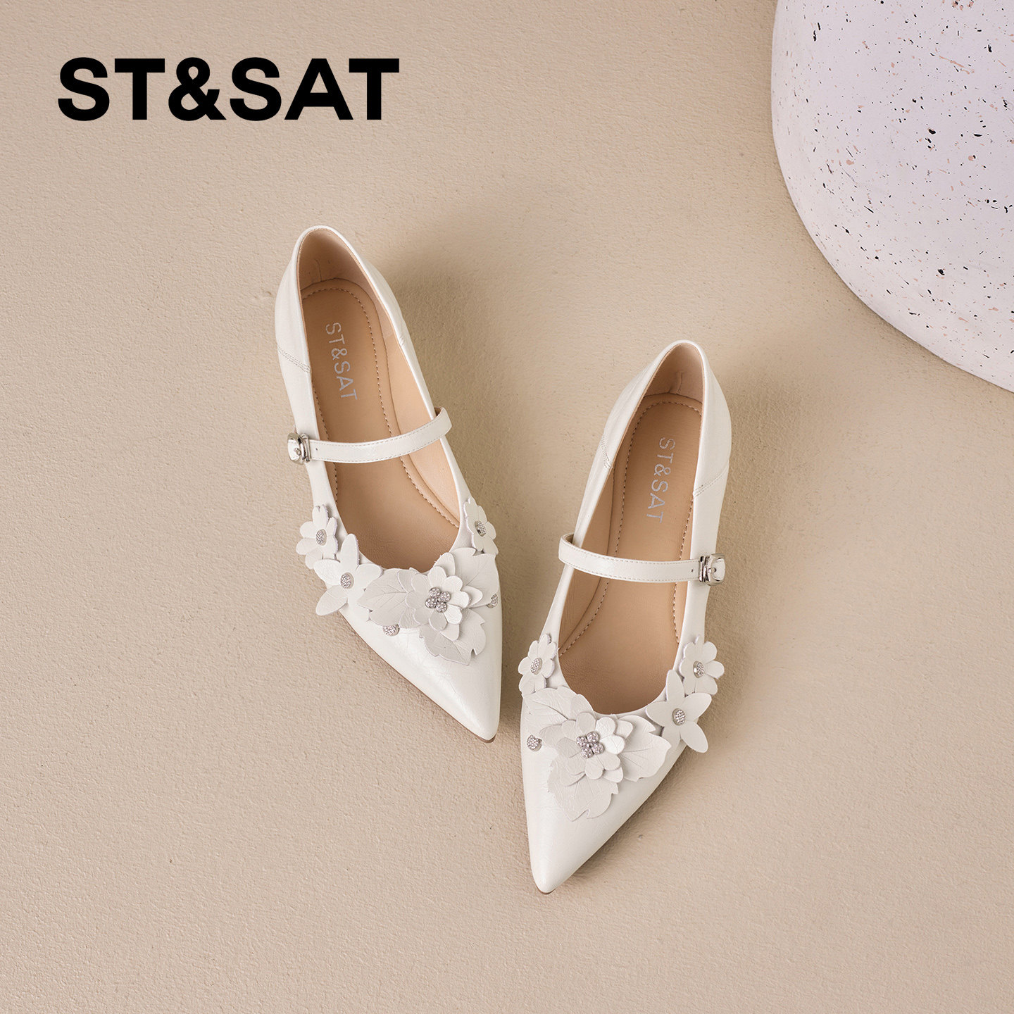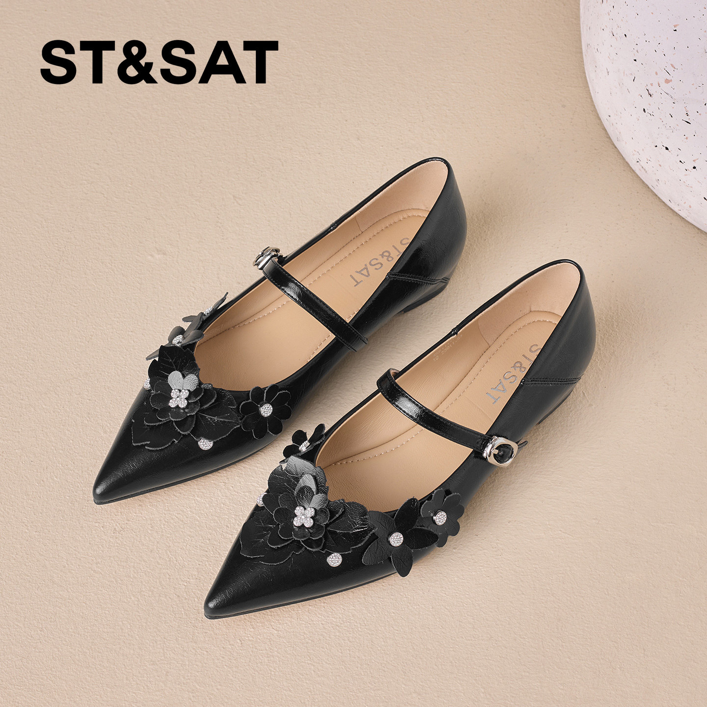 星期六真皮尖头坡跟花朵玛丽珍鞋女2026年春季新款内增高浅口单鞋