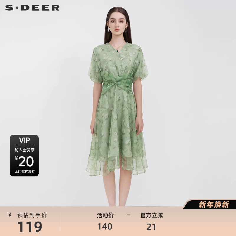 S·DEER圣迪奥女装V领碎花拼接泡泡袖连衣裙S223Z122J