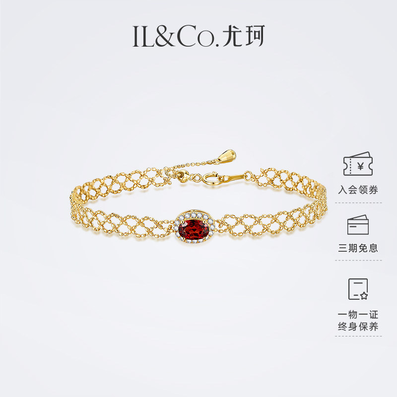 ILCO尤珂「花丝蔻 」黄18K金天然石榴石钻石围镶镂空编织设计手链
