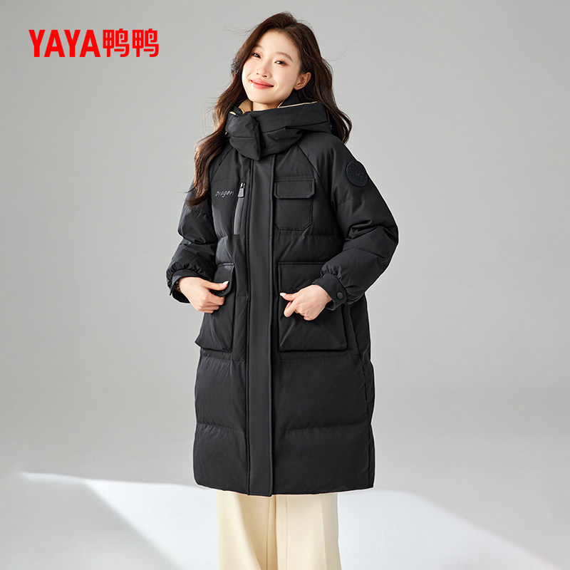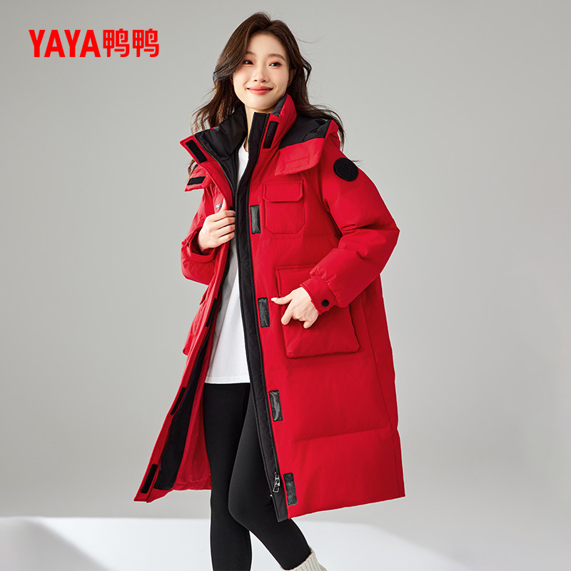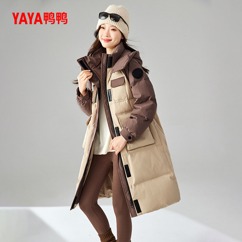 鸭鸭露营羽绒服女士2025冬季新款过膝中长款加厚保暖拼色鸭绒外套
