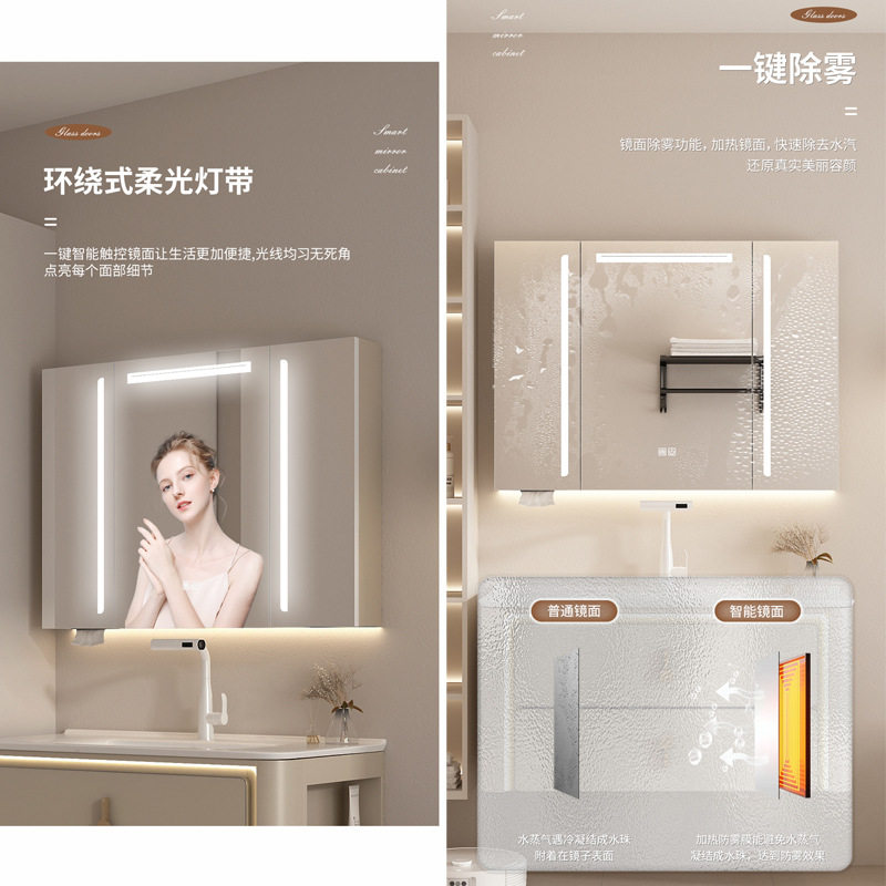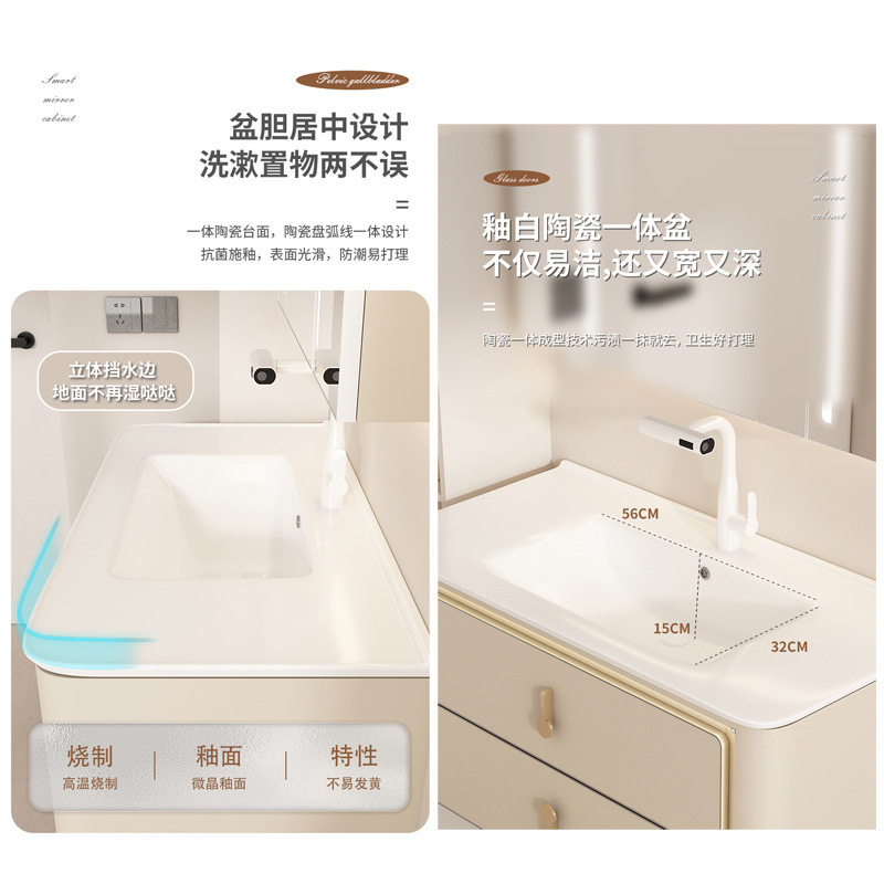 奶油风实木浴室柜双抽屉左右侧边置物美妆架氛围灯智能镜柜 839