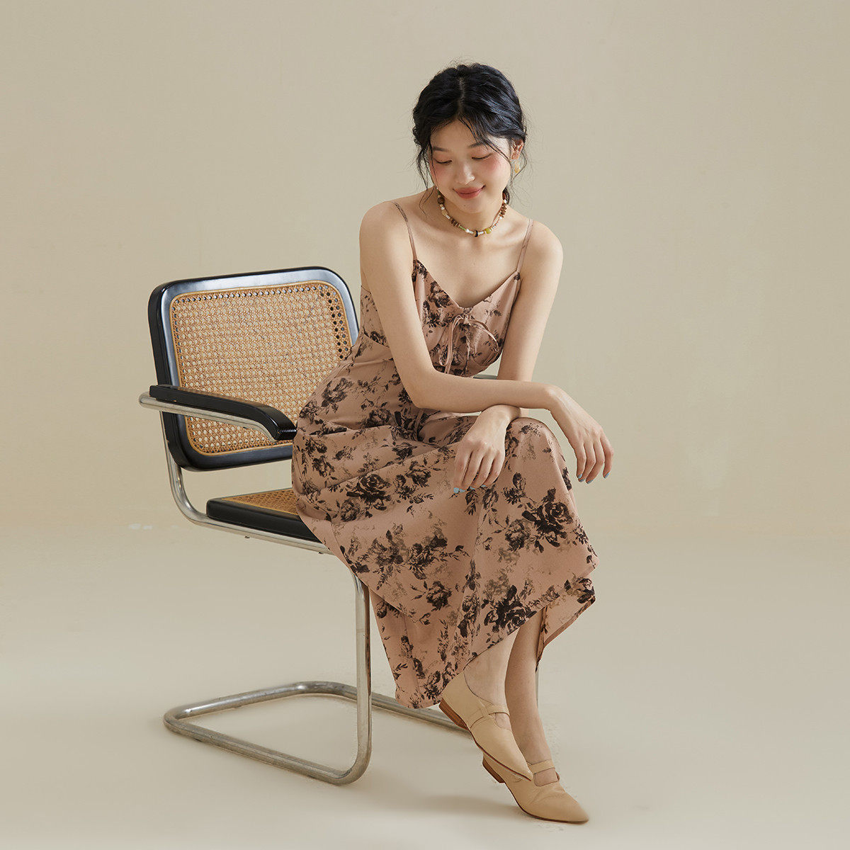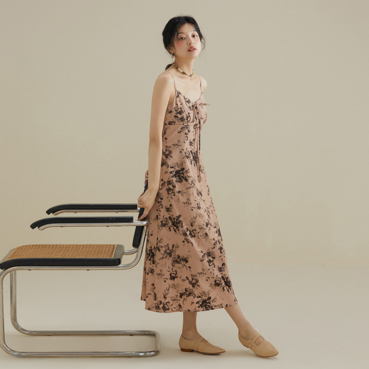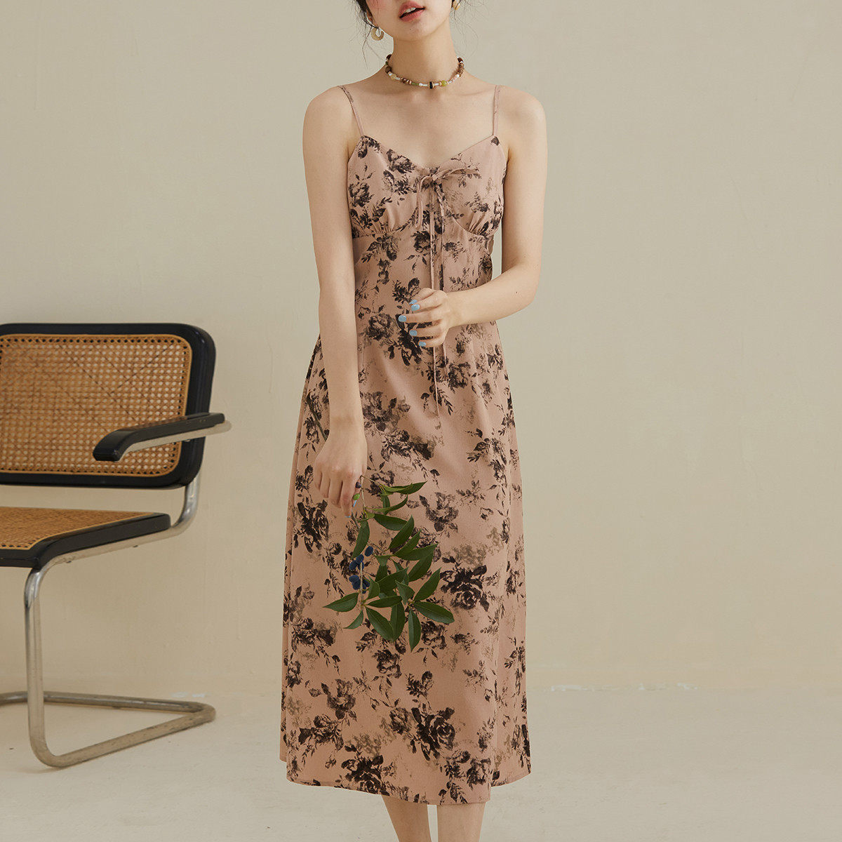 one more2025夏季新款气质碎花连衣裙高级感法式v领吊带裙女修身