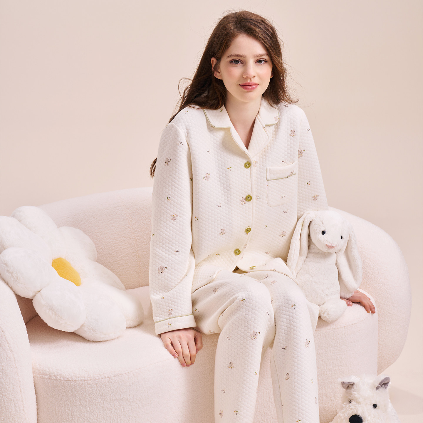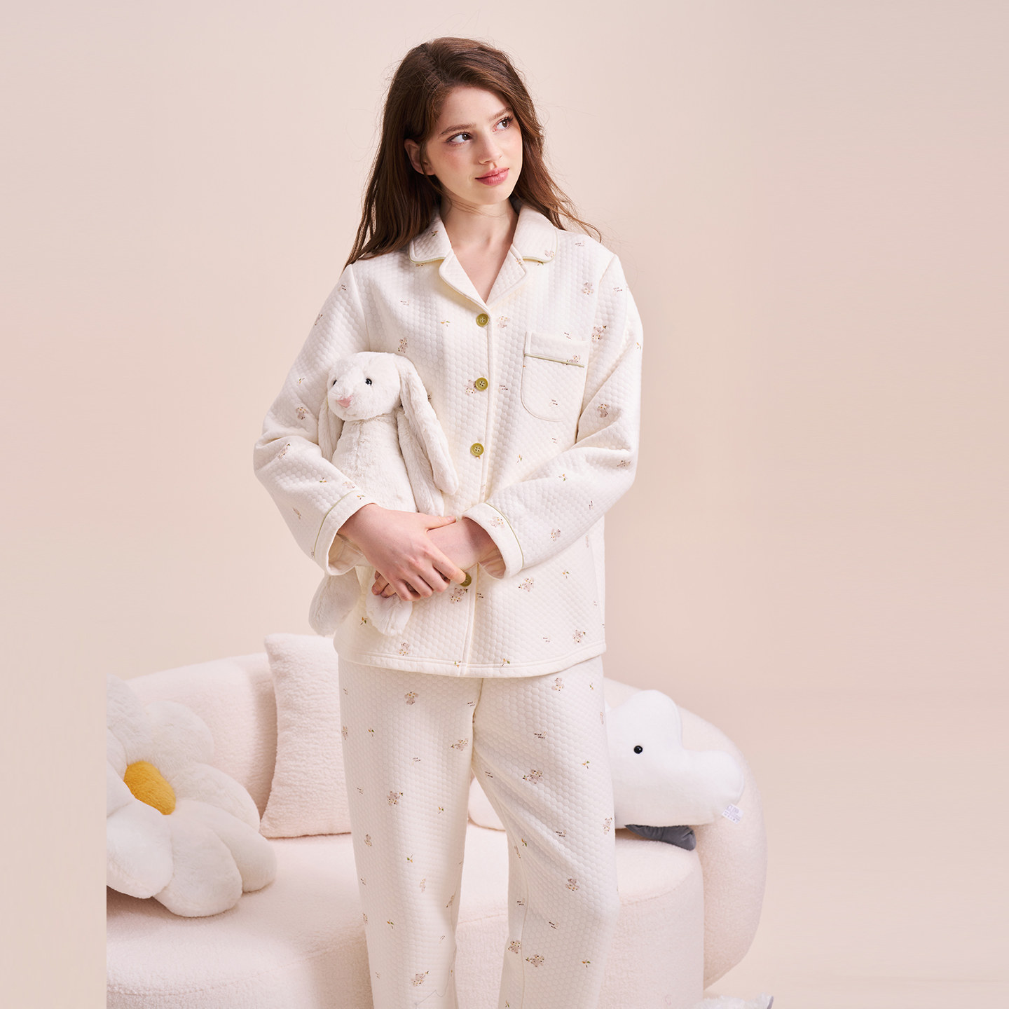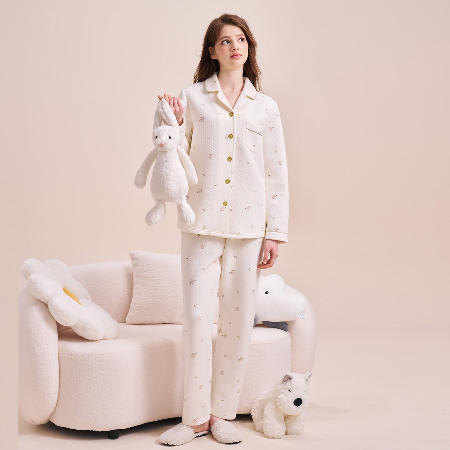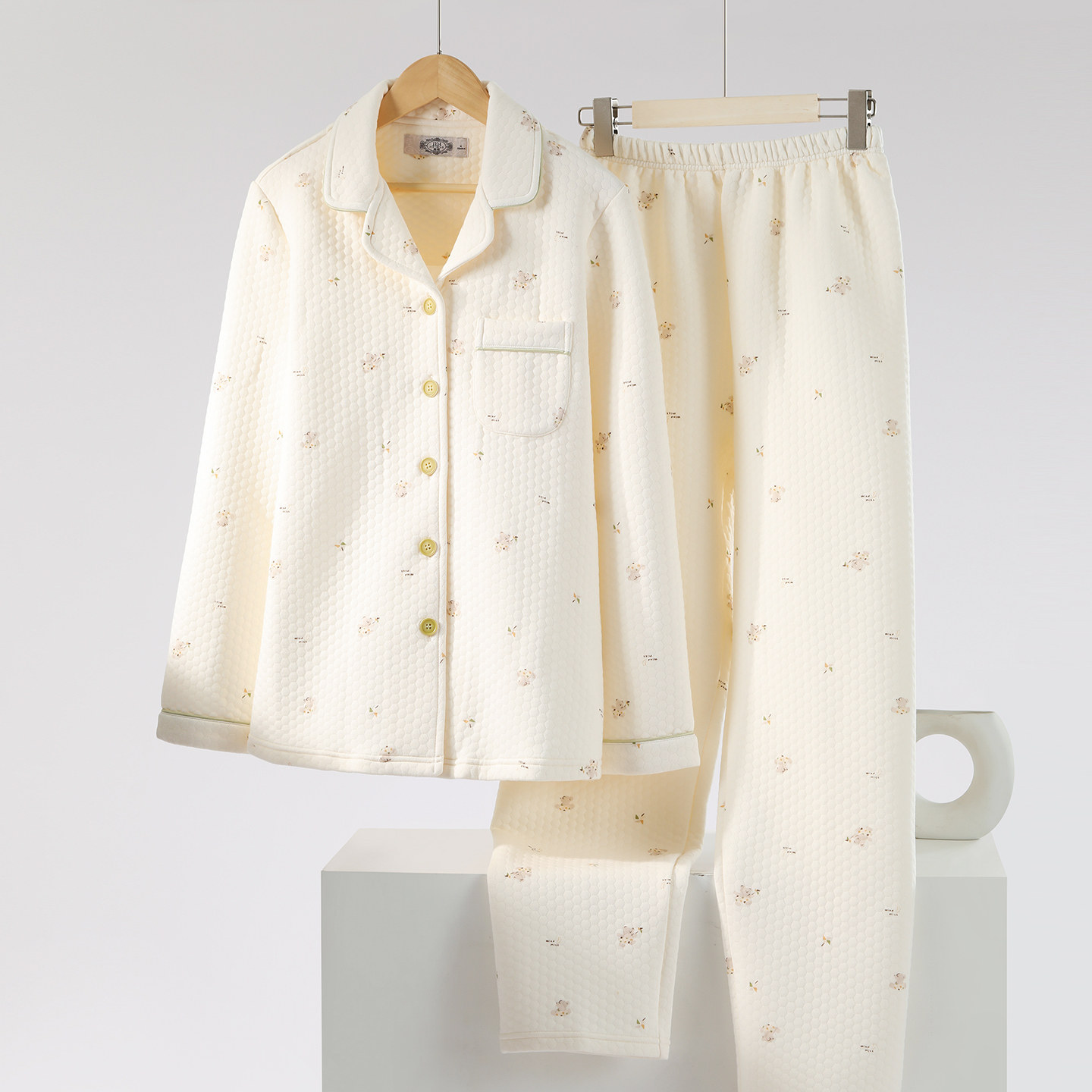 美标春秋新款三层夹棉纯棉睡衣套装女可外穿休闲卡通全棉家居服冬