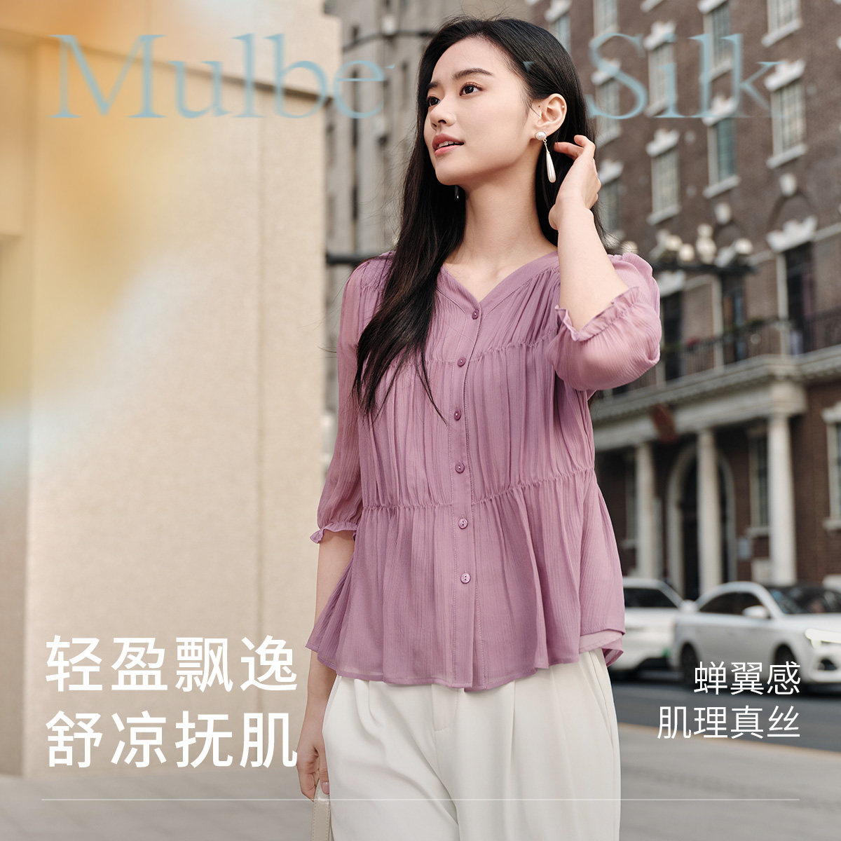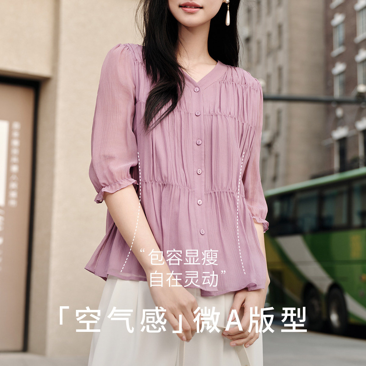 菲妮迪真丝衬衫2026春新款100%桑蚕丝高端V领花边上衣女