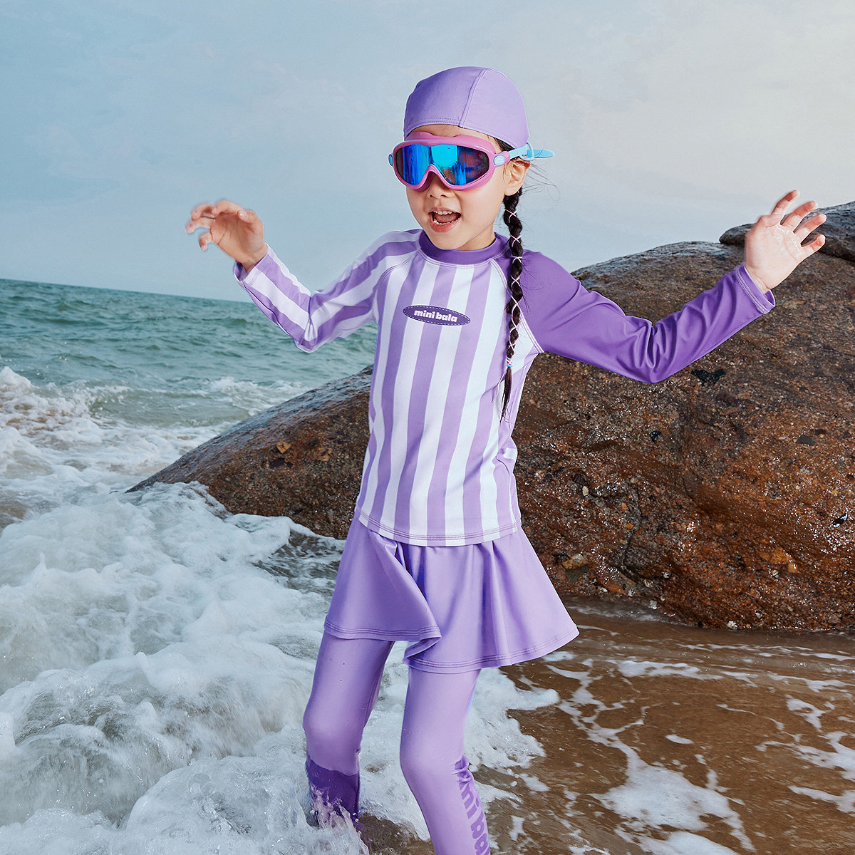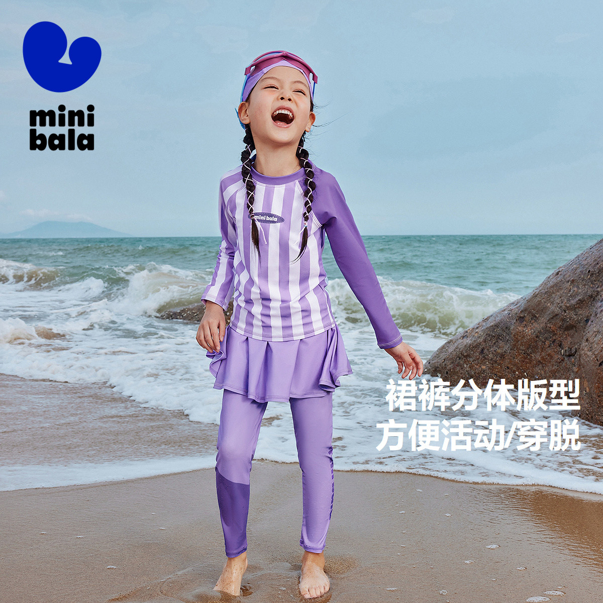 【UPF50+】迷你巴拉巴拉女童游泳衣长袖分体裙裤夏季防晒带泳帽