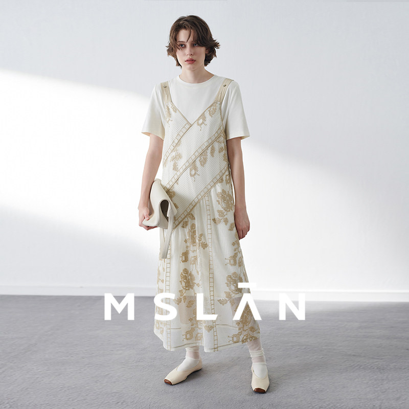 两件套/MSLAN春夏镂空蕾丝中长款叠穿透气短袖T恤连衣裙MGAT255
