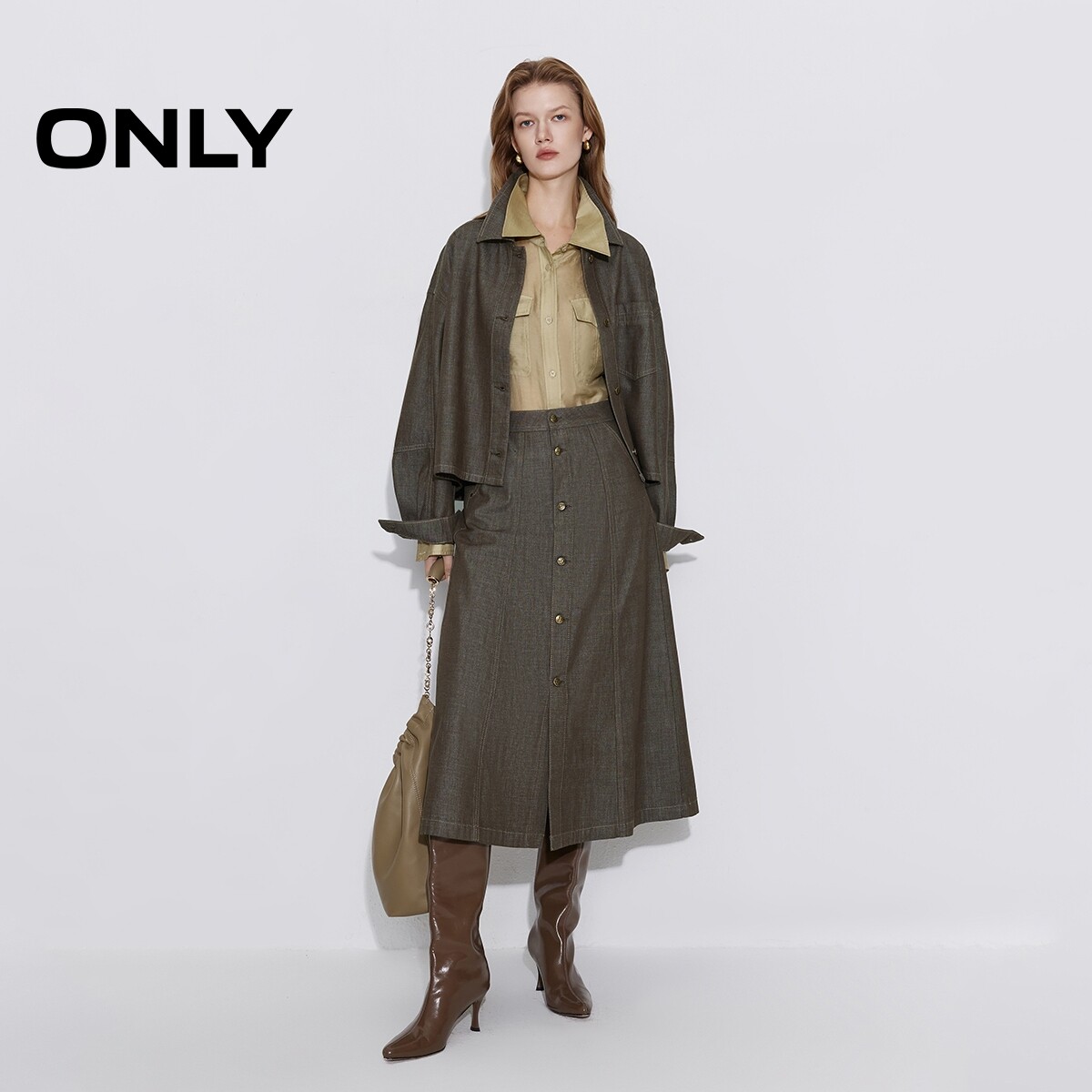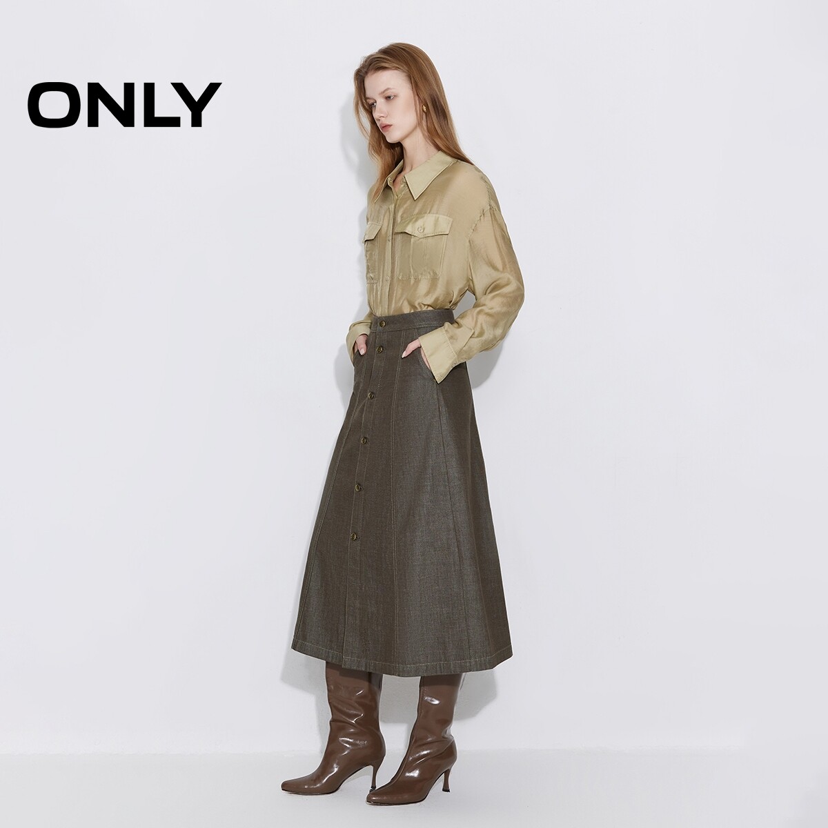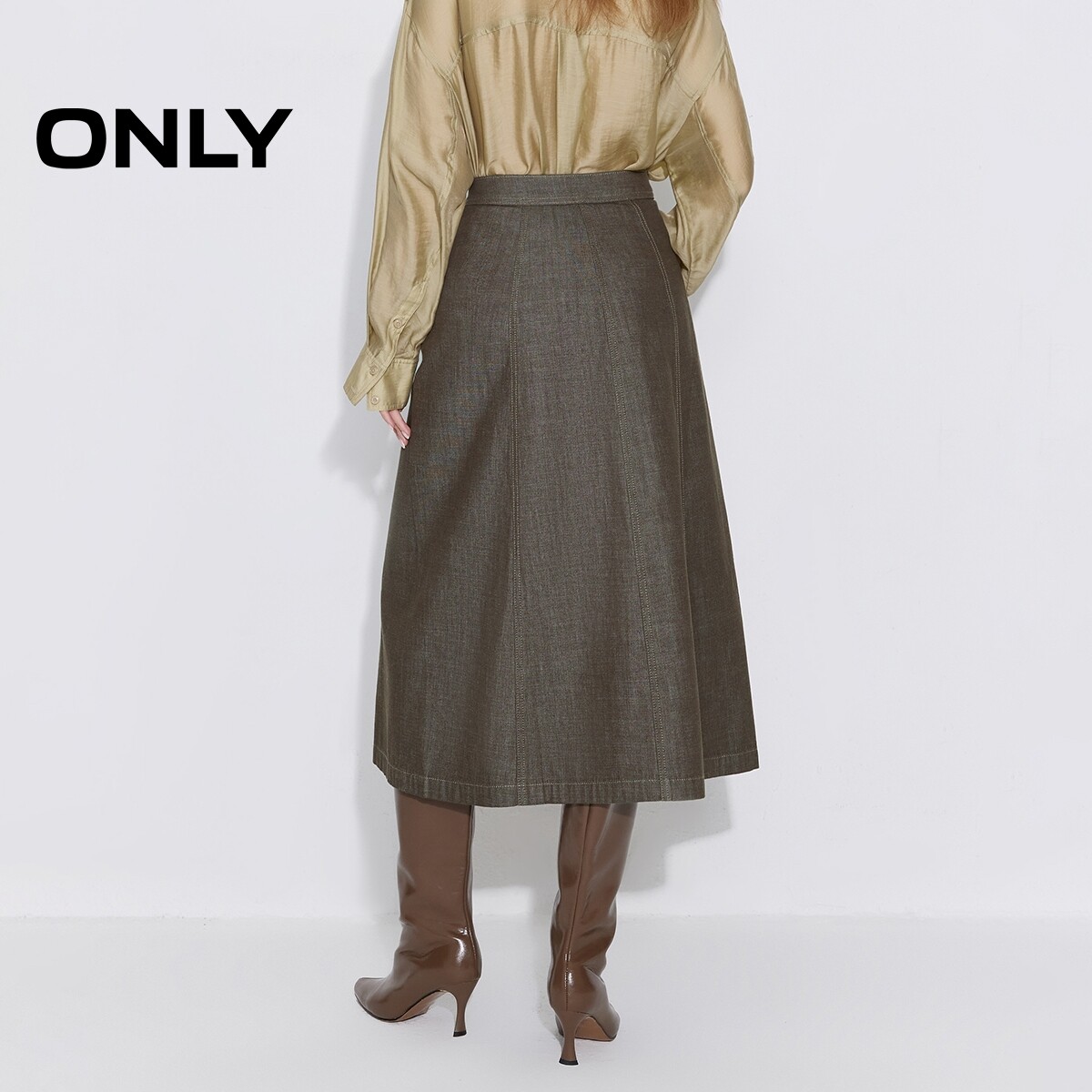 ONLY2026春季新款纯棉扣饰挺阔A字显瘦剪裁牛仔裙长裙半身裙女