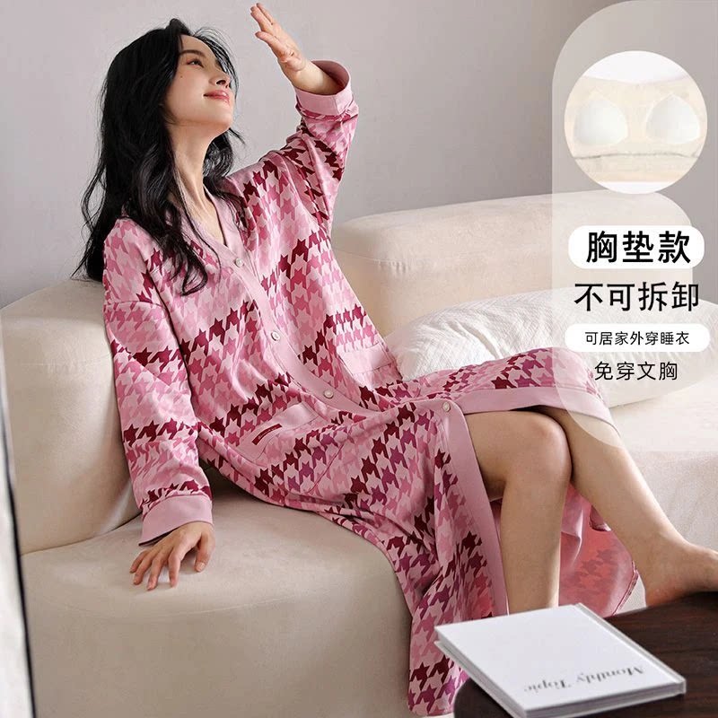 带胸垫一体睡裙女秋冬2025新款长袖睡衣青年甜美宽松千鸟格家居服