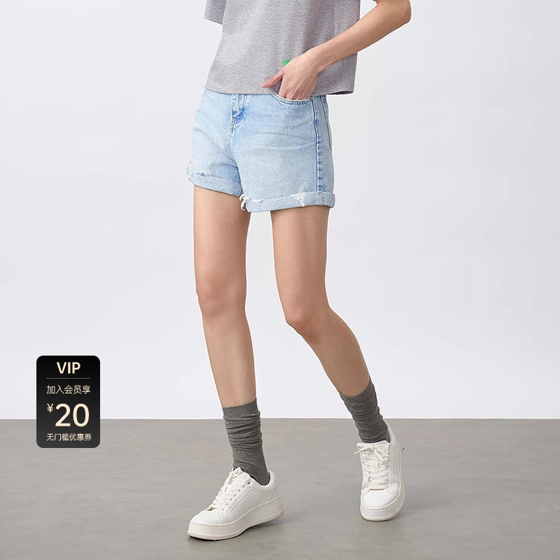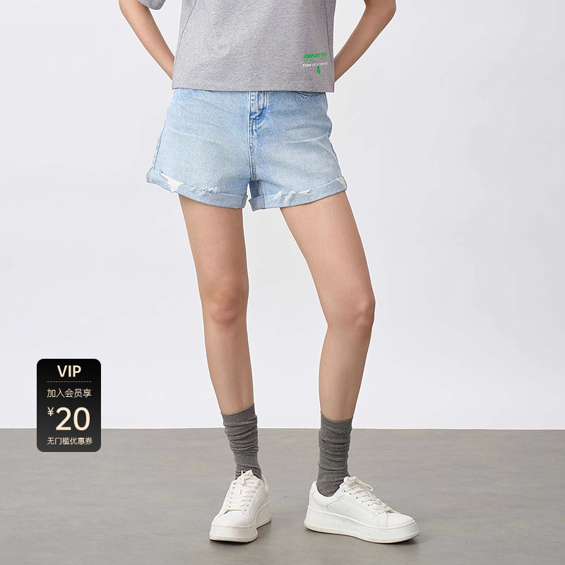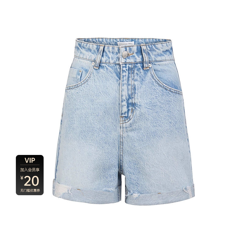 sdeer圣迪奥女装25年新品高腰插袋做旧磨破卷边牛仔短裤S25260903