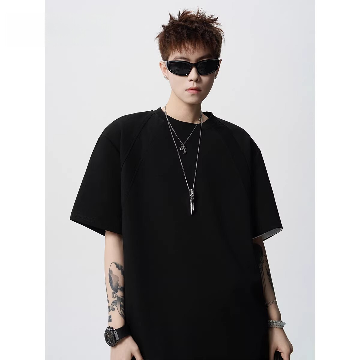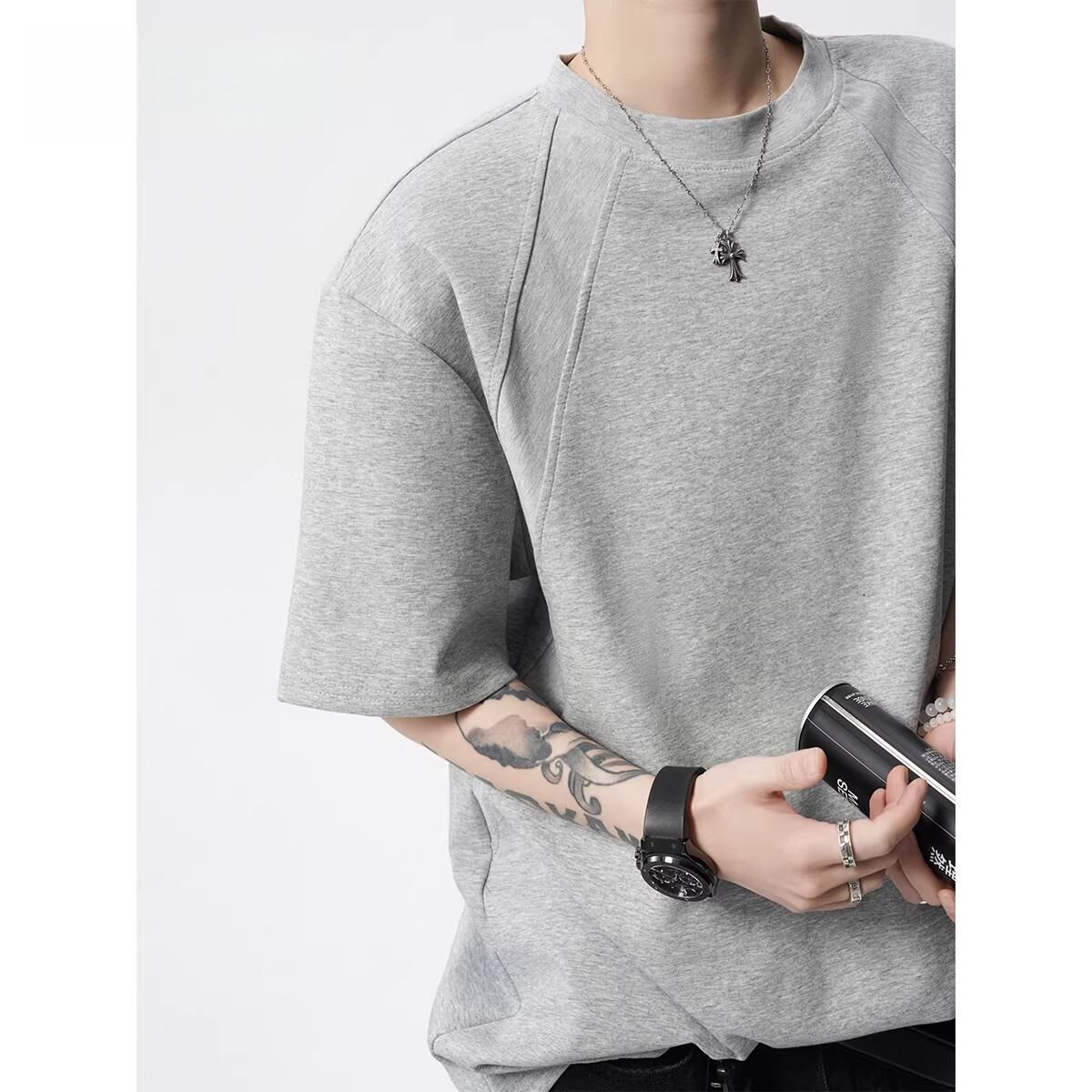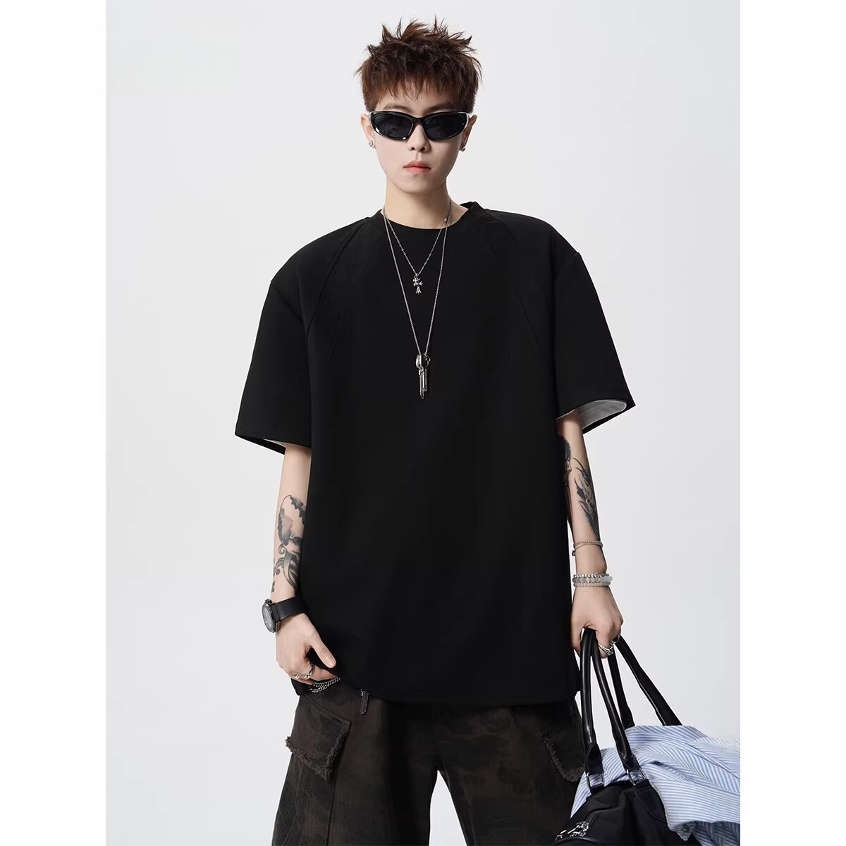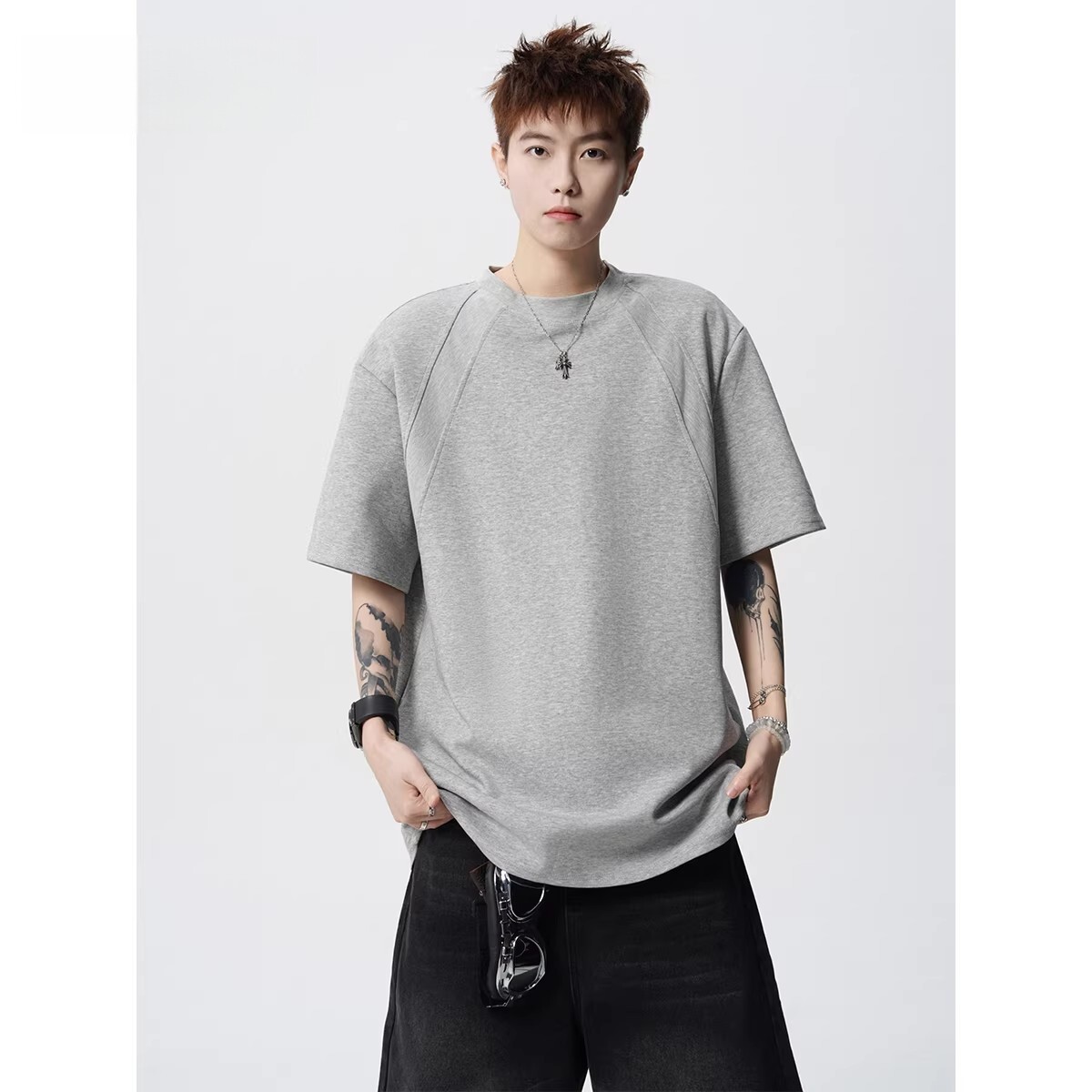 美式解构拼接纯色T恤男春重磅boxy宽松短袖体恤复古休闲圆领上衣