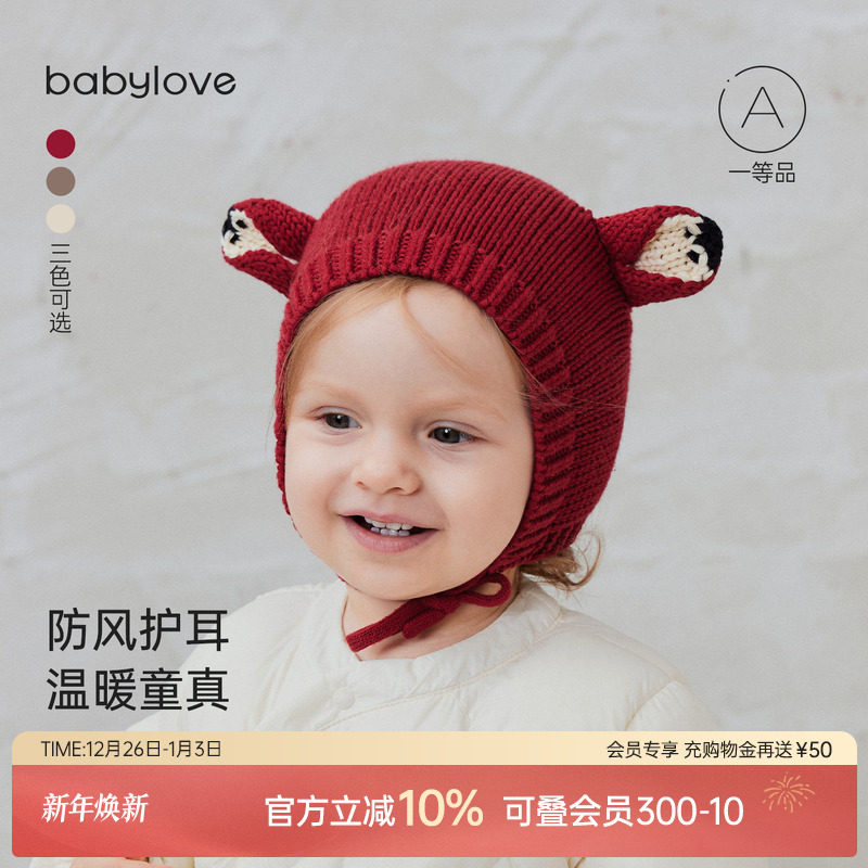 babylove宝宝毛线帽冬季纯棉保暖针织帽子婴儿纯色新年防风护耳帽