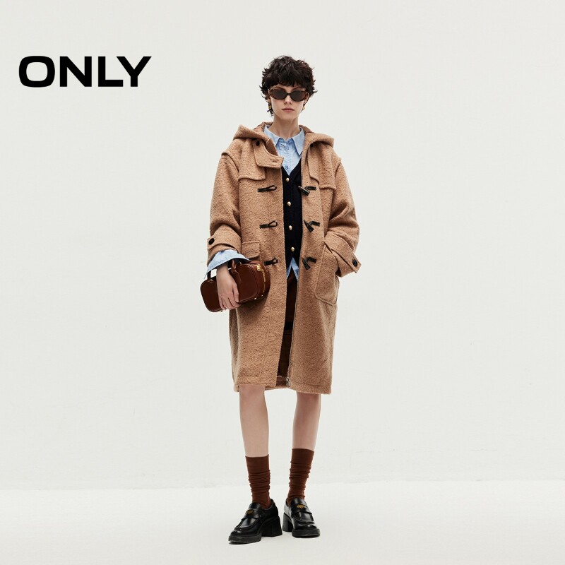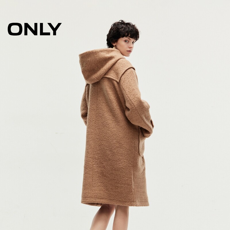 【ONLY奥莱】春季新款含绵羊毛气质连帽中长款毛呢大衣女
