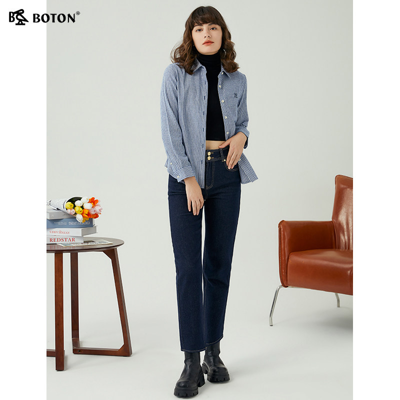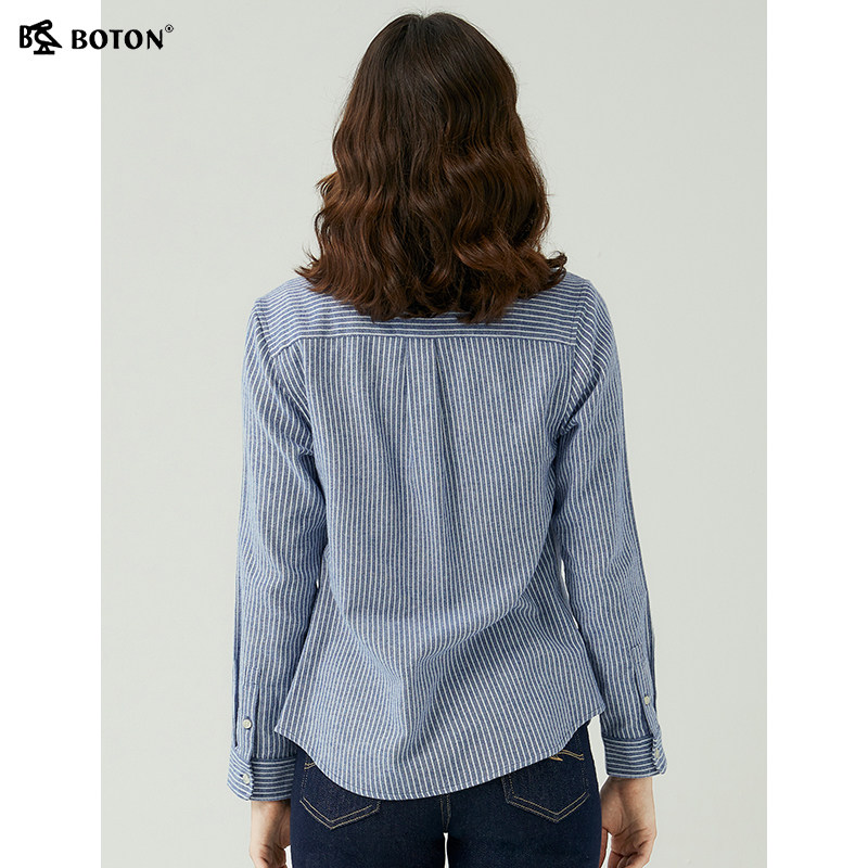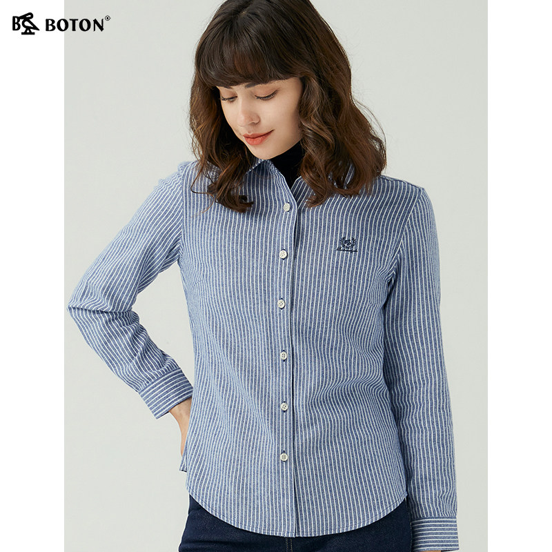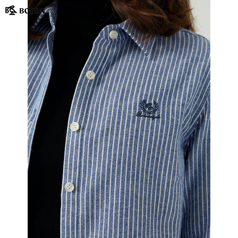 [长绒棉]波顿2025春秋新款女长袖蓝白条纹衬衫美式休闲英伦风衬衣