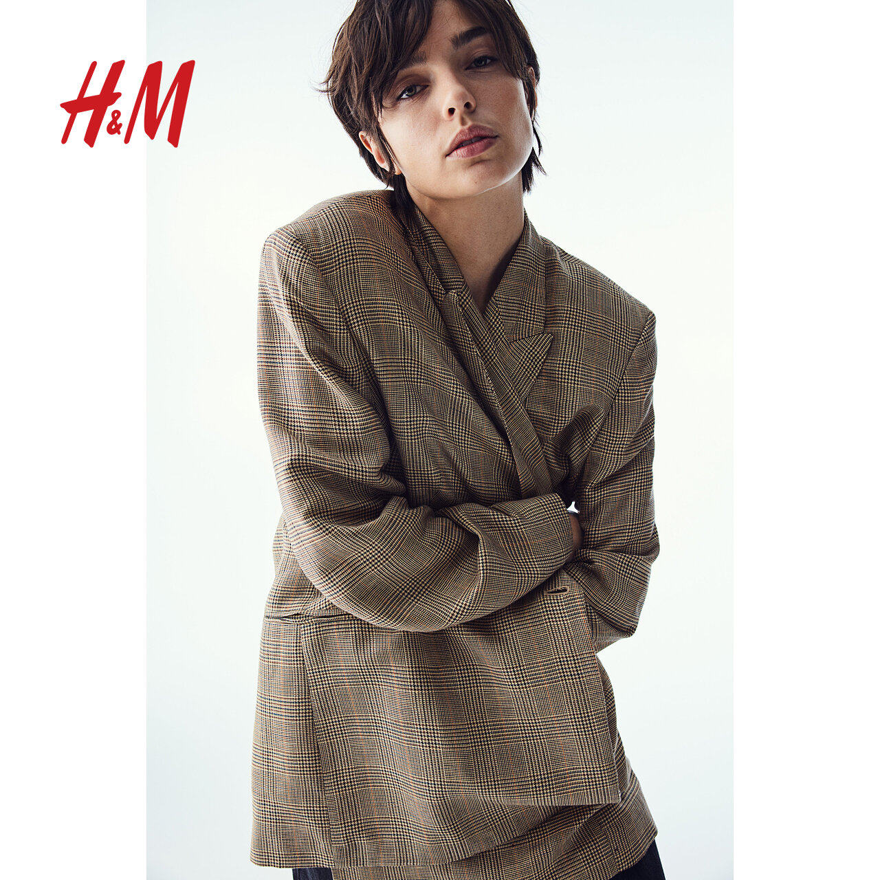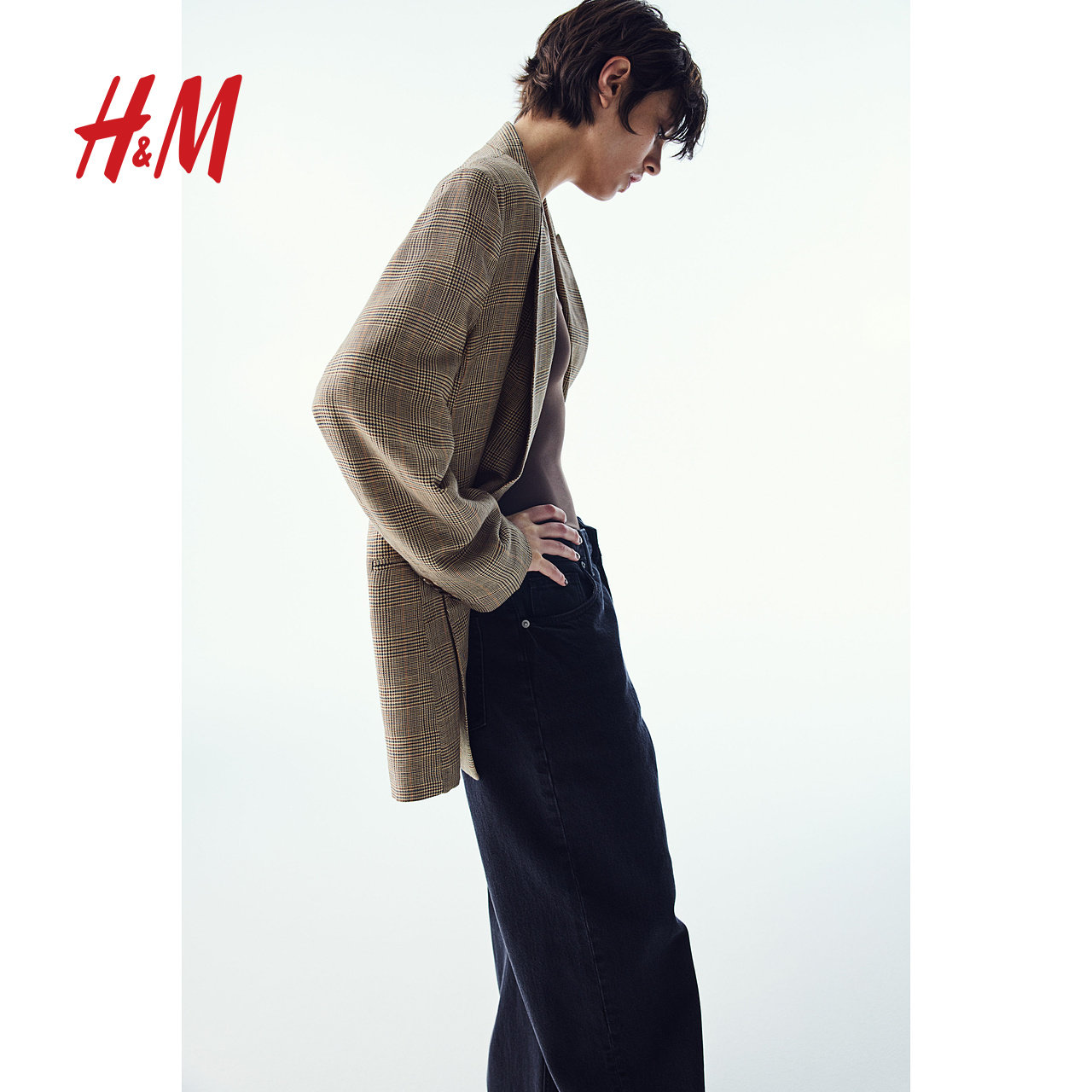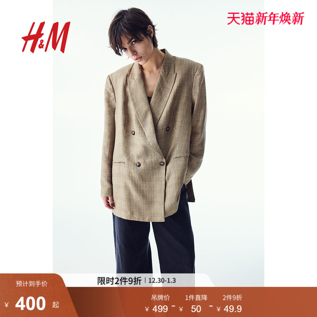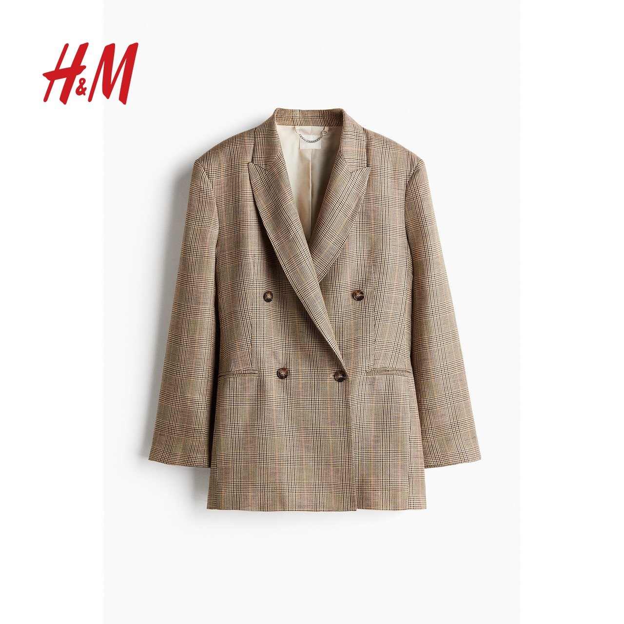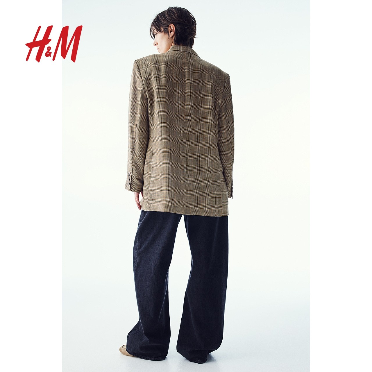 HM2025年秋季新款女装时尚休闲格纹亚麻混纺休闲西装1272051