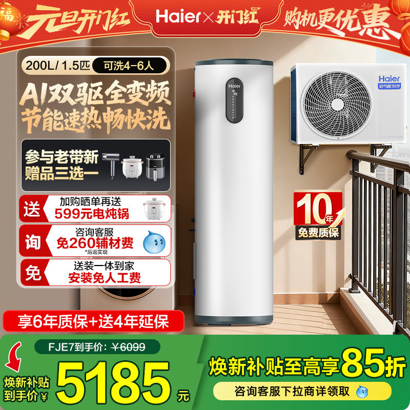 海尔小红花套系空气能热水器家用200升变频超一级FJE7节能F5E7