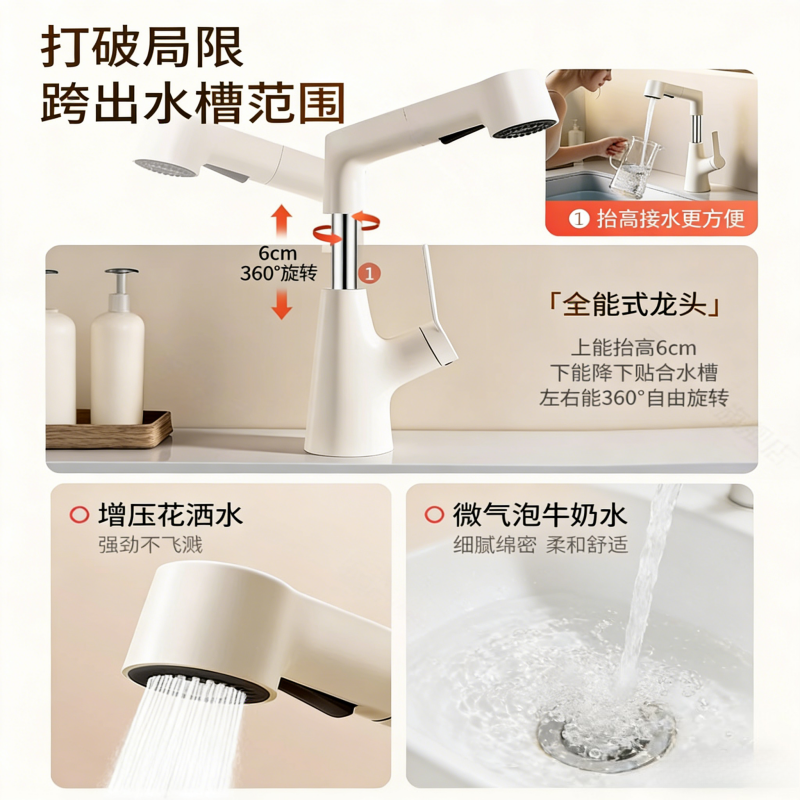 洗脸盆水龙头冷热水二合一面盆龙头家用浴室洗手台抽拉式全铜厨房