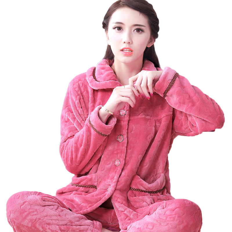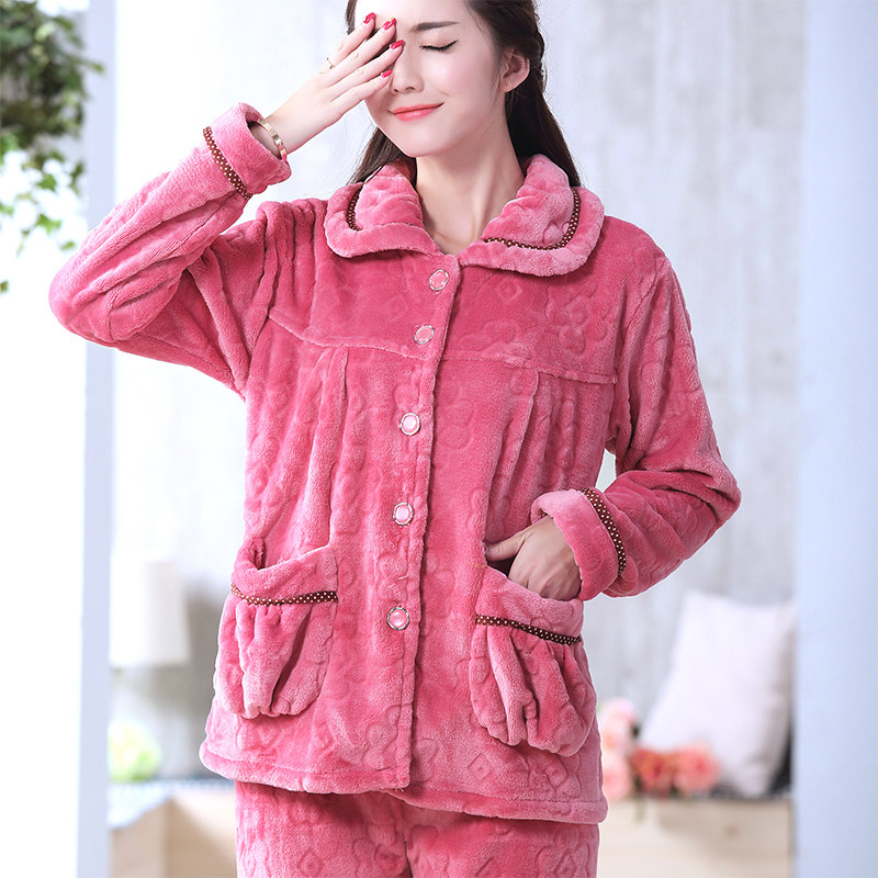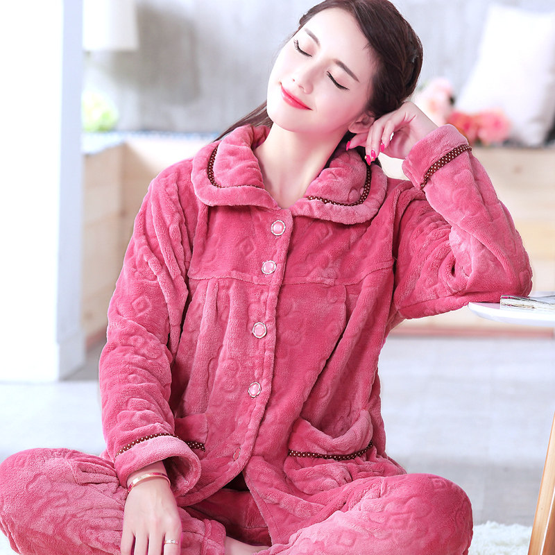 红豆秋冬季加厚珊瑚绒睡衣女冬大码长袖套装开衫中年女士法兰绒家