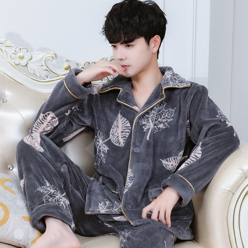 红豆睡衣男秋冬季珊瑚绒加绒加厚保暖长袖开衫法兰绒男士可外穿家