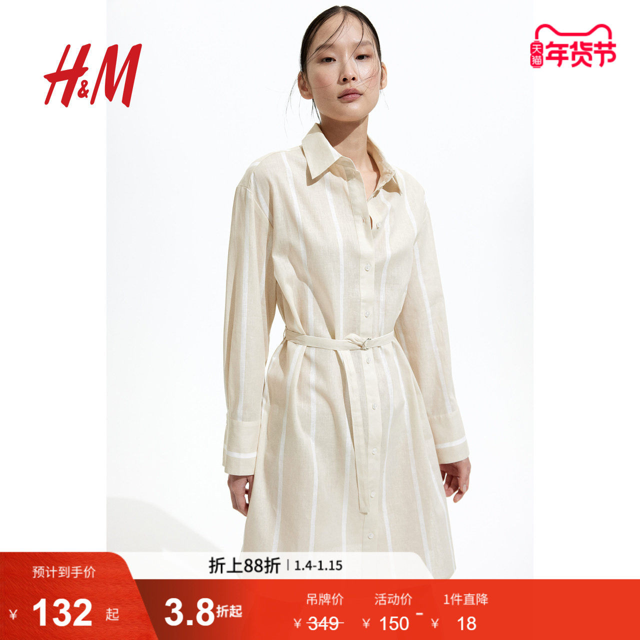 HM女装连衣裙春季新款时尚透气亚麻混纺及膝衬衫式连衣裙1275768
