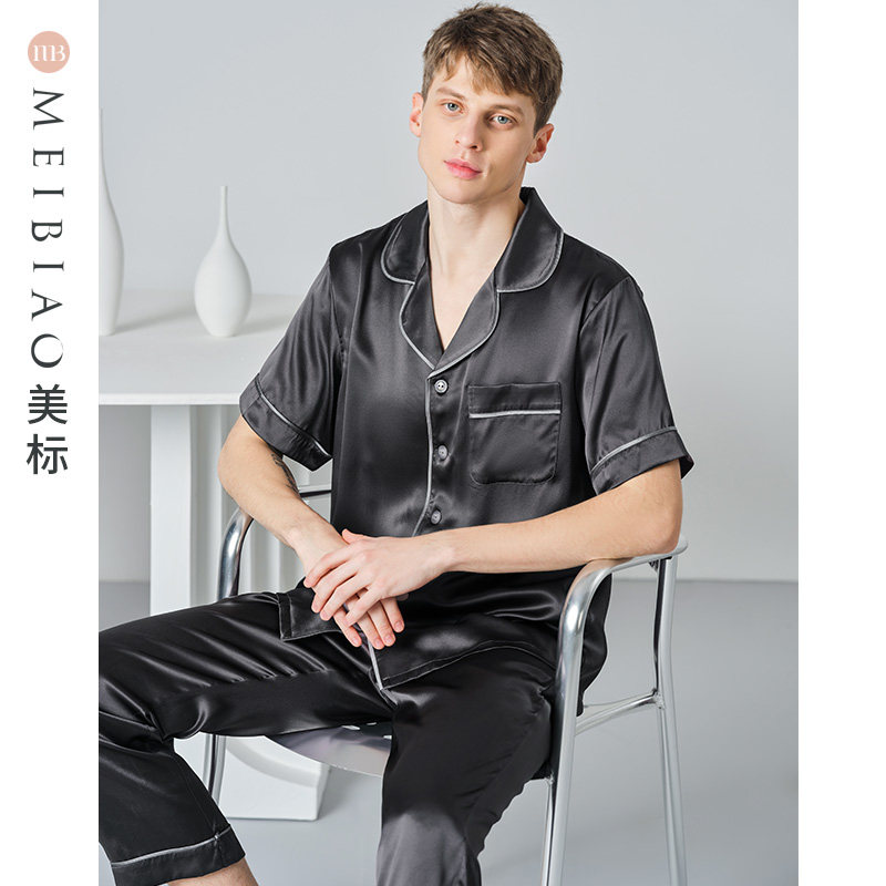 美标男士春秋长袖真丝睡衣两件套装19姆米重磅桑蚕丝丝绸家居服夏