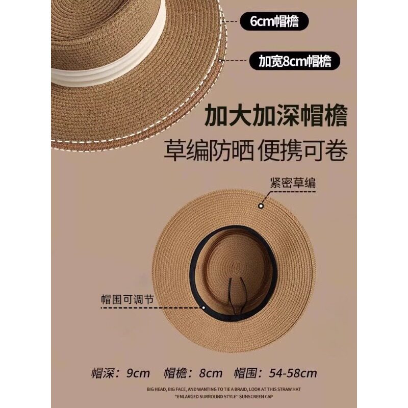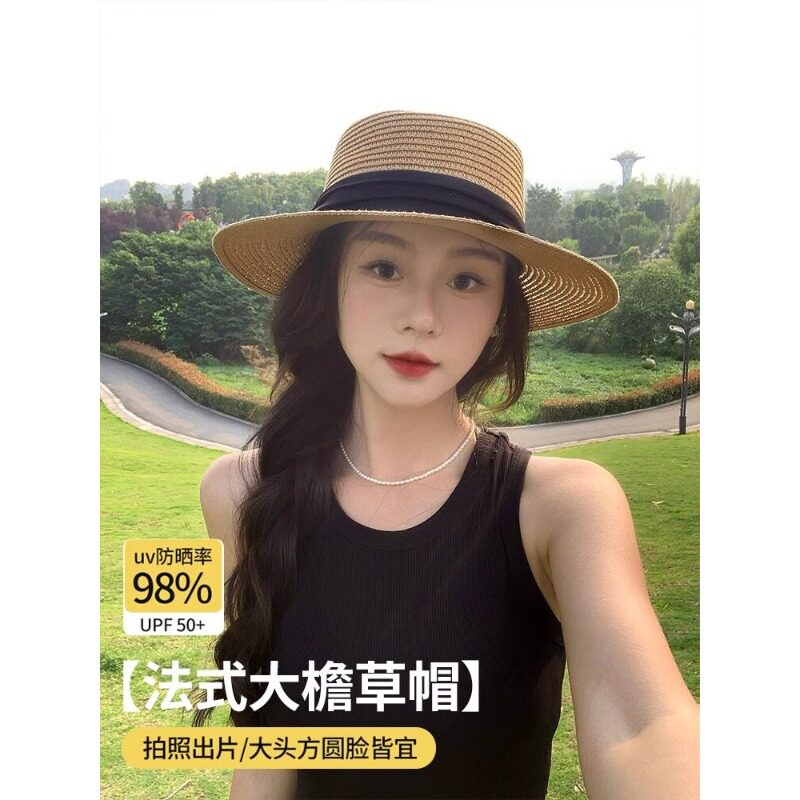 大头围草帽女2026新款海边沙滩法式平顶编织防晒帽遮阳高级感